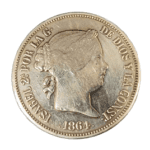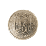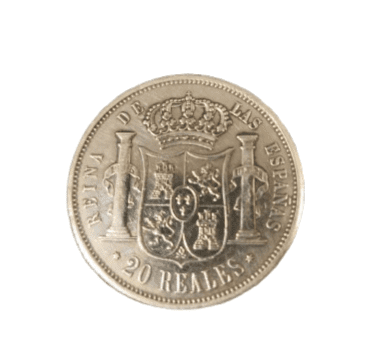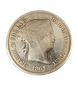 Moneda de plata de 20 reales de Isabel II de 1864 con un peso de 23.60 gramos.