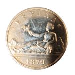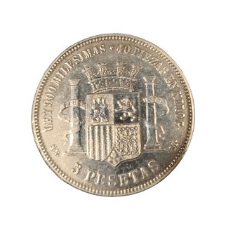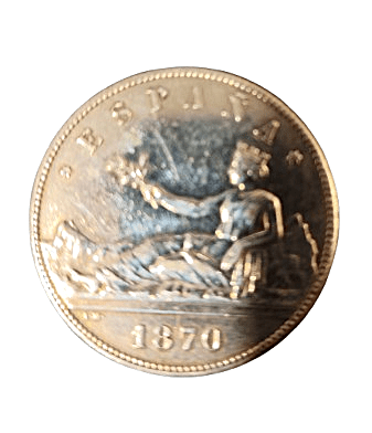 Moneda de plata de 5 pesetas de 1870, *SNM, con un peso de 23.35 gramos.