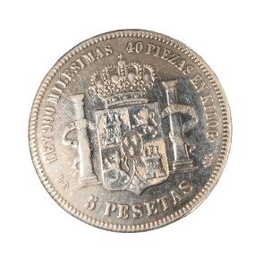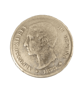Moneda de plata de 5 pesetas de Alfonso XII de 1875, *DEM, con un peso de 23.77 gramos.