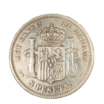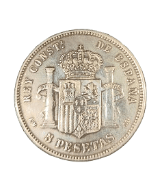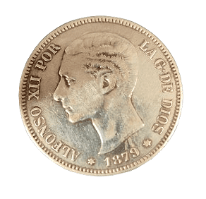 Moneda de plata de 5 pesetas de Alfonso XII de 1879, *DEM, con un peso de 23.54 gramos.