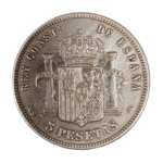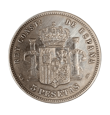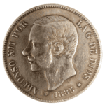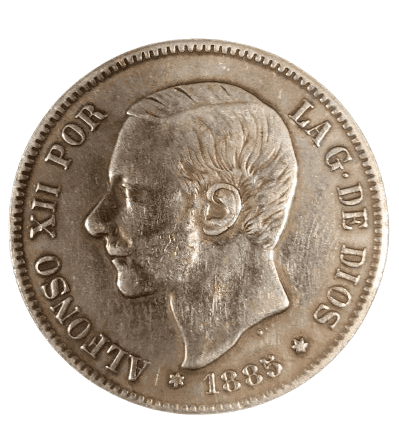 Moneda de plata de 5 pesetas de Alfonso XII de 1885, *MSM, con un peso de 23.40 gramos.