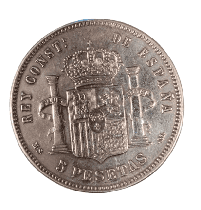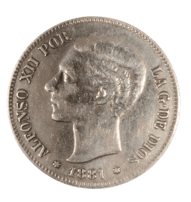 Moneda de plata de 5 pesetas de Alfonso XII de 1881, * MSM, con un peso de 23.81 gramos.