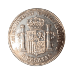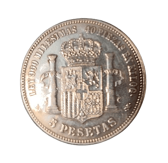 Moneda de plata de 5 pesetas de Amadeo I de 1871, *18/74 DEM, con un peso de 23.60 gramos.