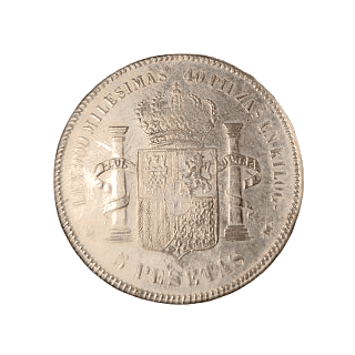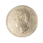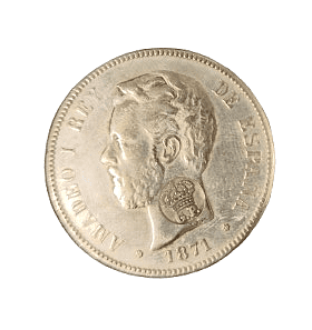 Moneda de plata de 5 pesetas de Amadeo I de 1871, *SDM, con un peso de 23.70 gramos.