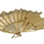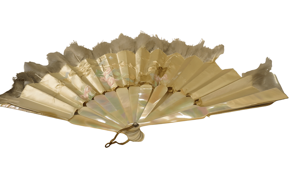 Abanico de plumas con motivos florales y varillaje de nácar del siglo XIX.