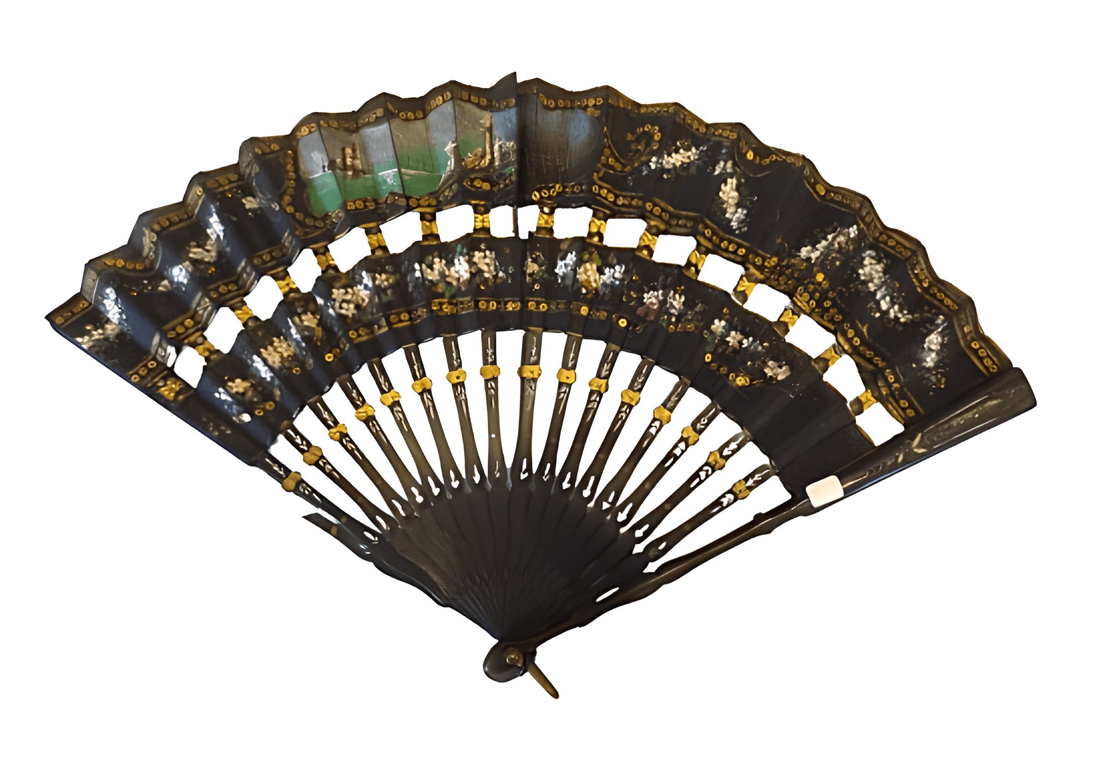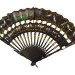 Abanico escalonado de dos filas de color negro con motivos florales de finales del siglo XIX y principios del XX.