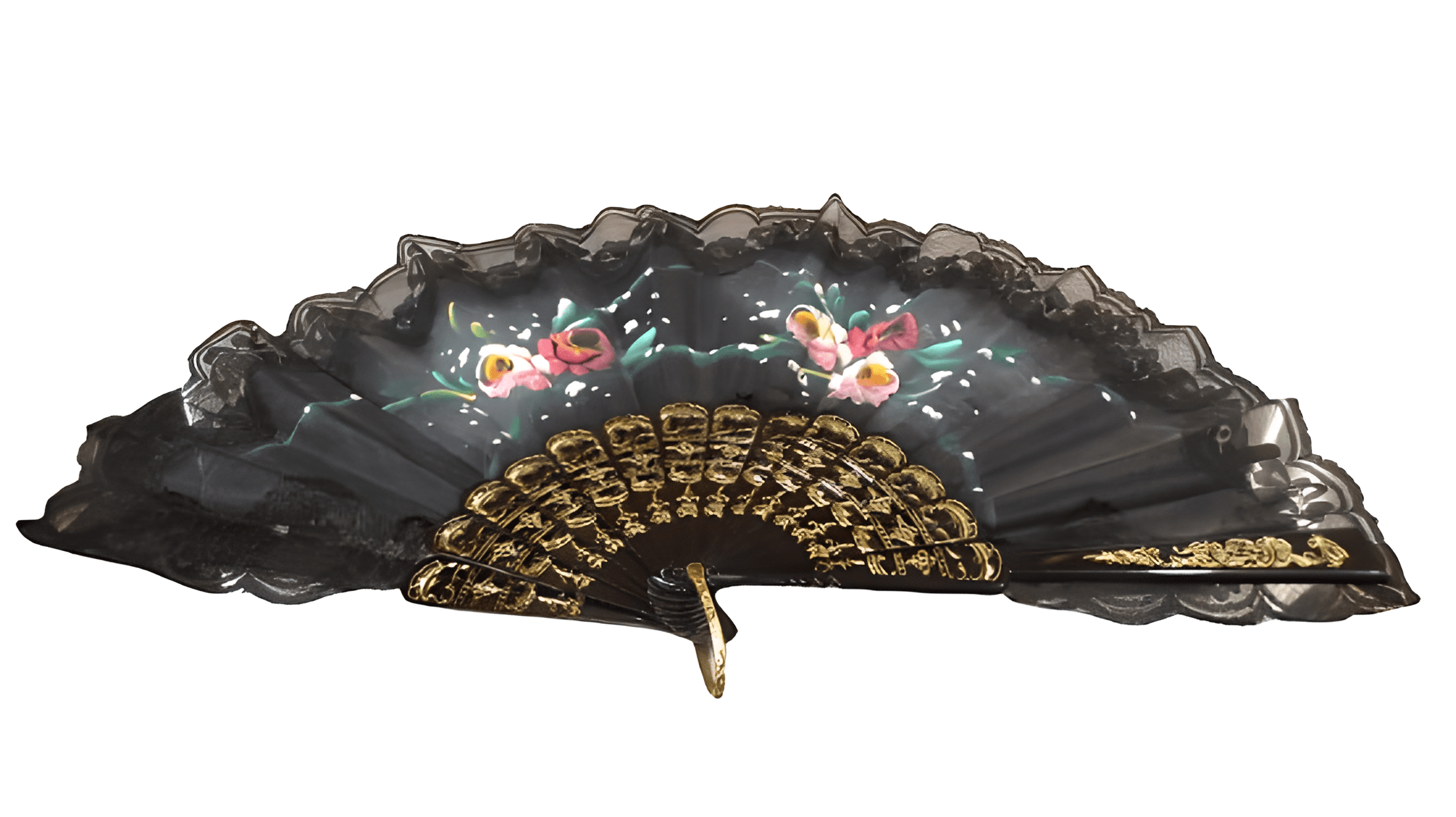 Abanico de color negro con motivos florales pintados a mano y varillaje con decoraciones de oro de finales del siglo XIX y principios del XX.