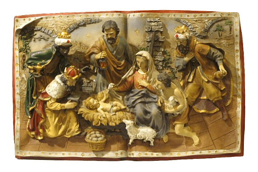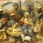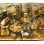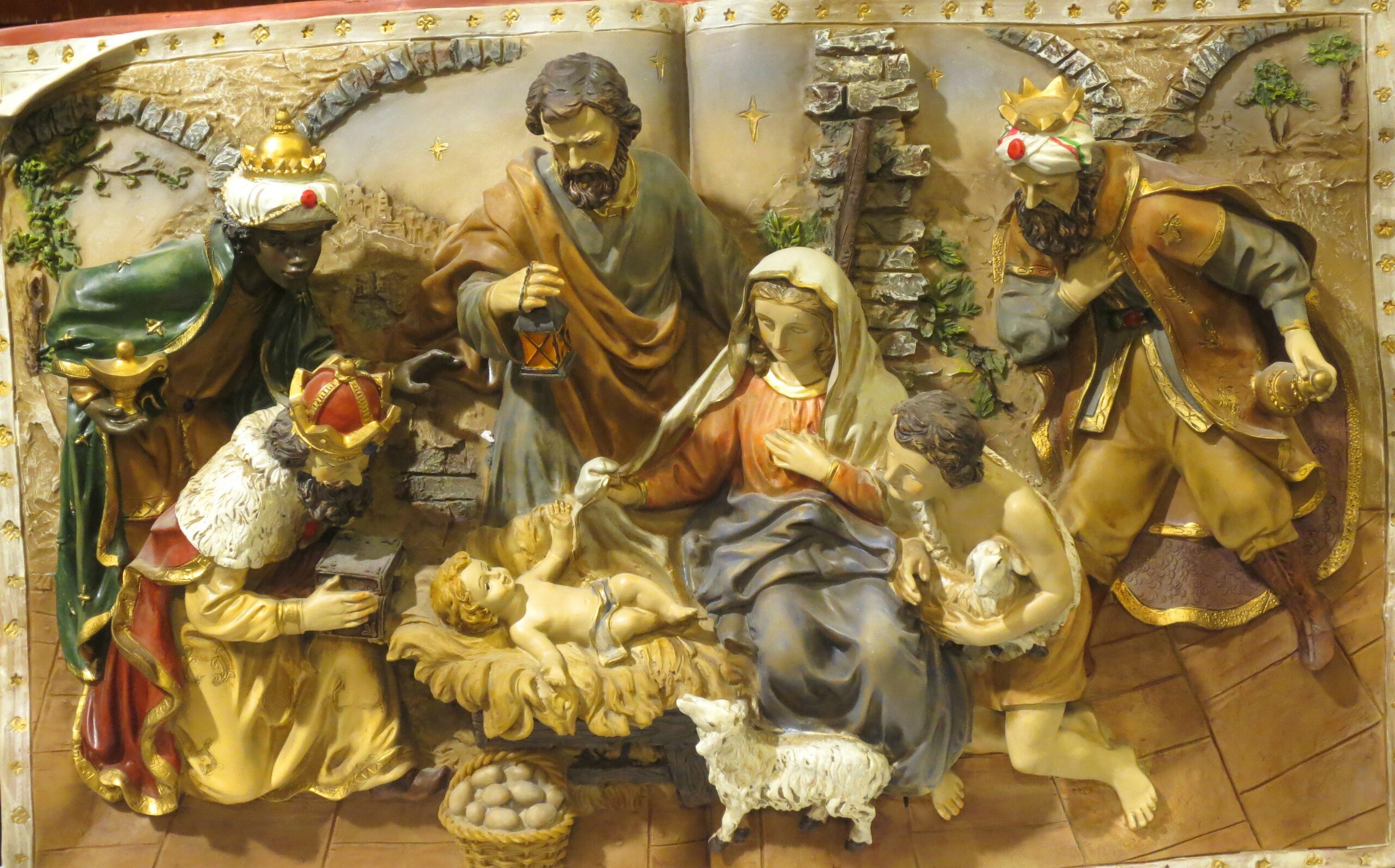 Relieve de escayola policromado del siglo XX que representa la adoración de los Reyes Magos de Oriente.