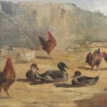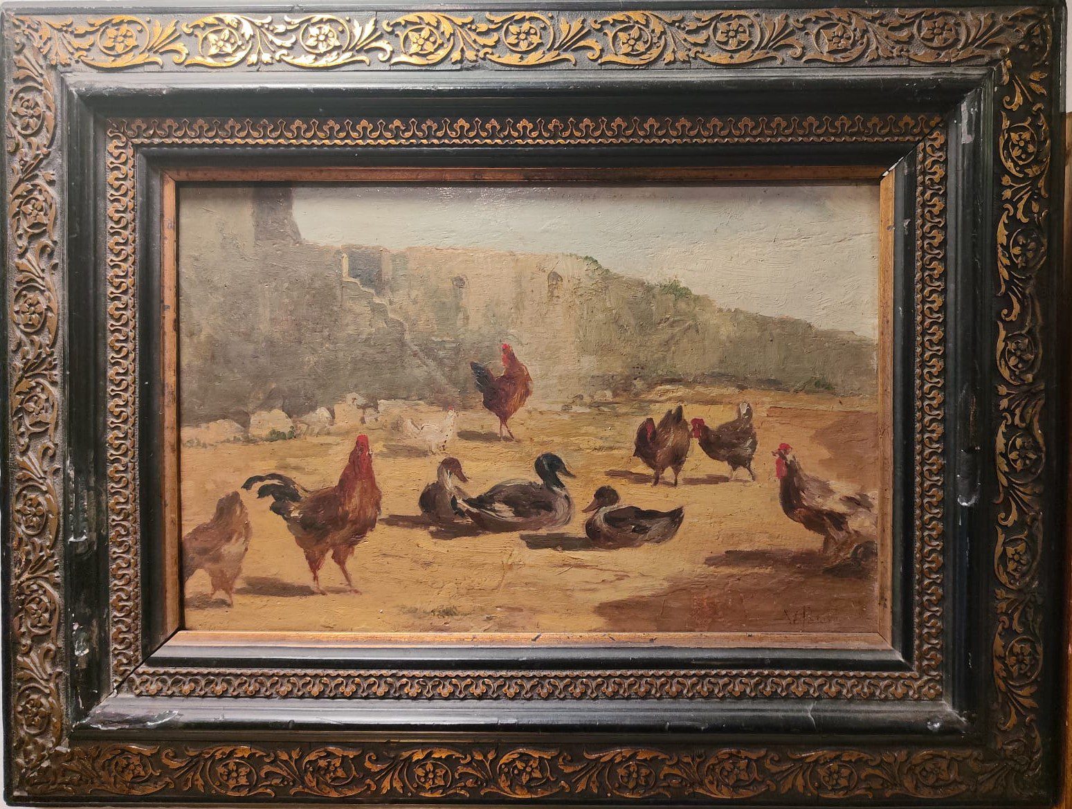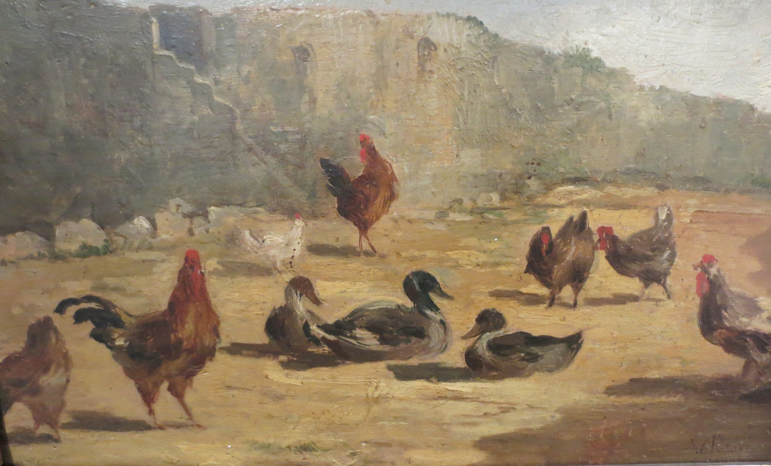 Óleo sobre tabla representado algunas aves de corral, realizado por Vicente Polero y Toledo (1824-1911).