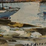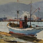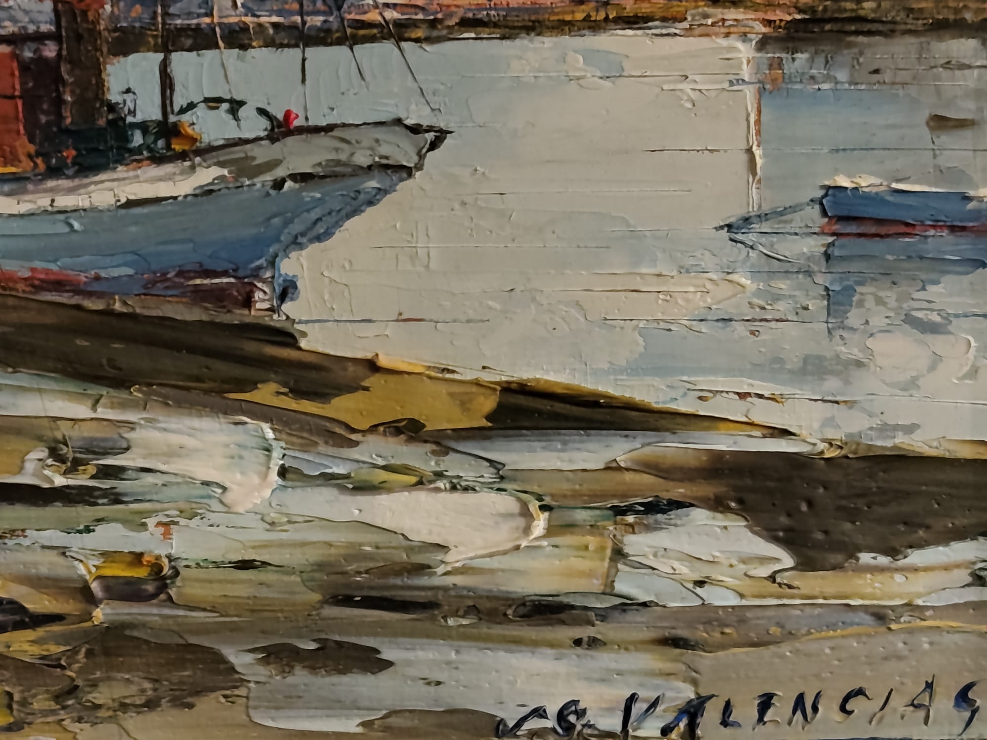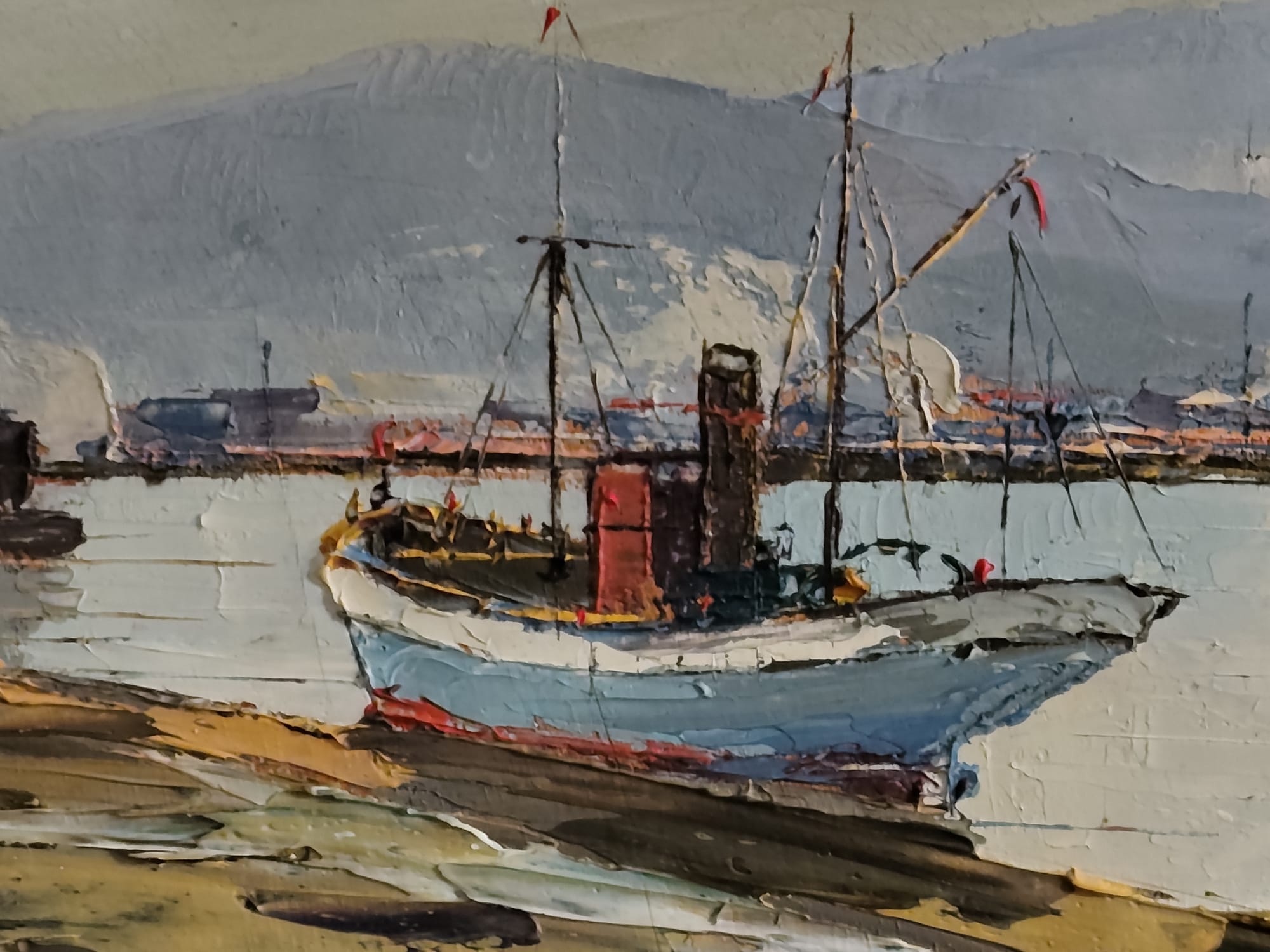 Óleo sobre lienzo que representa un barco pesquero del norte de España, realizado por Juan Benito Olivares Valenciaga-Balenciaga ( 1909-).