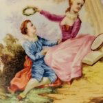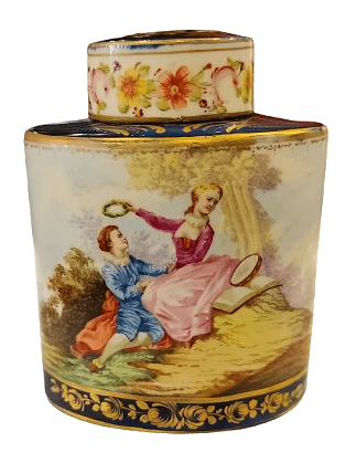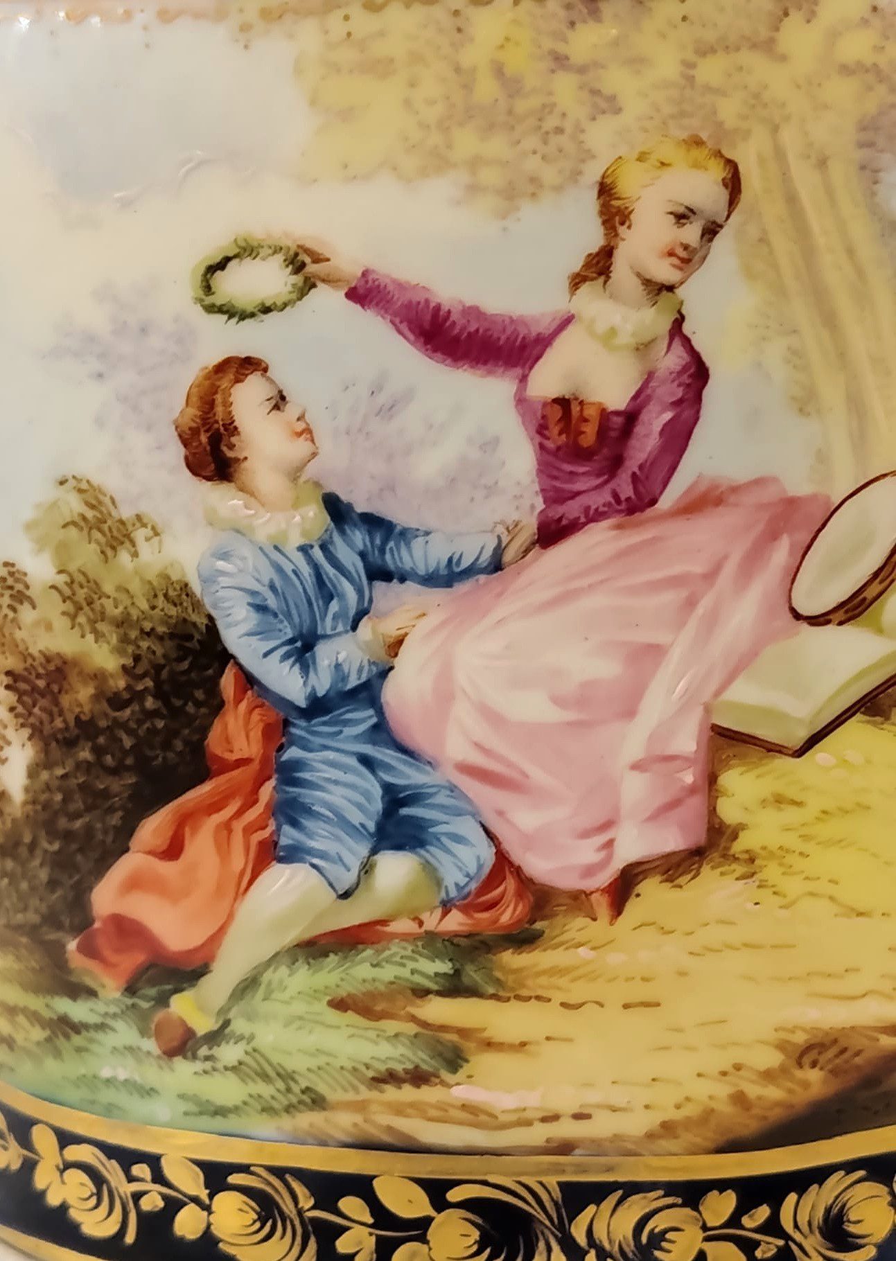 Bote con tapa hecho de porcelana Sevres con escenas románticas del siglo XIX.