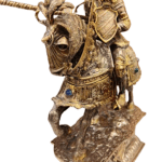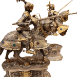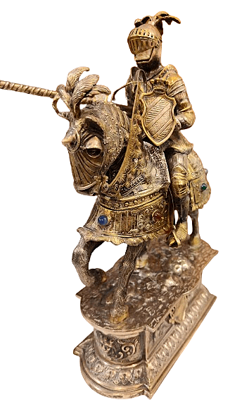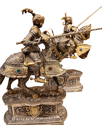 Dos esculturas que representan a dos caballeros de plata con caras de marfil y piedras semipreciosas en la base.