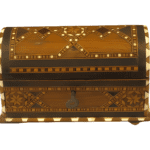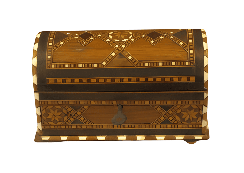 Caja de madera en forma de cofre con marquetería y hueso, vintage, del siglo XX.