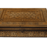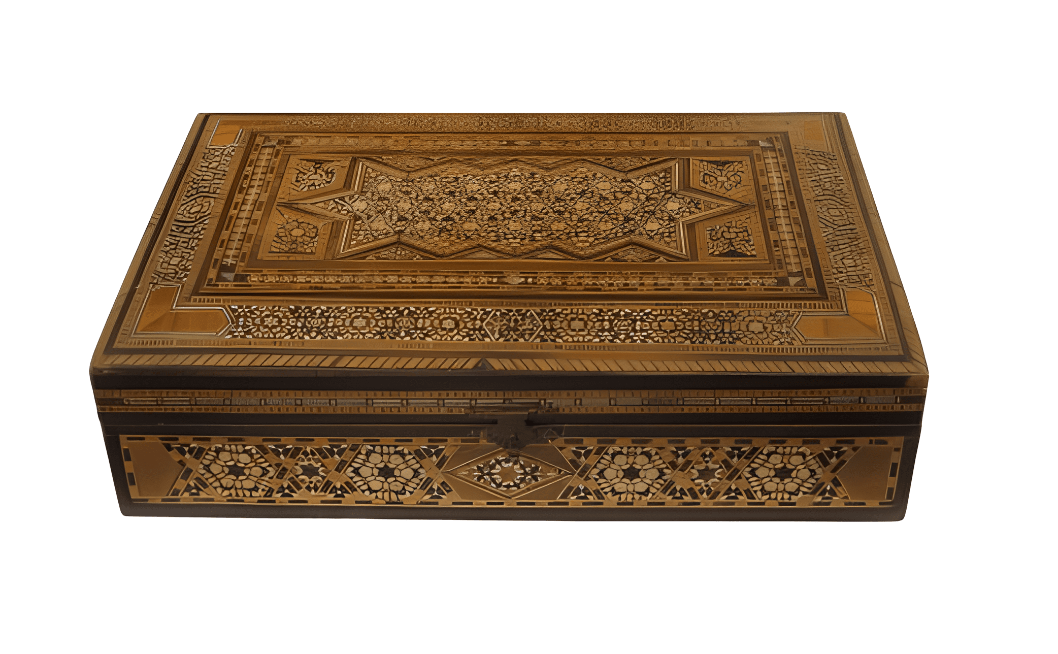 Caja de madera de grano de arroz con nácar, realizada al estilo Mudéjar, vintage, del siglo XX.