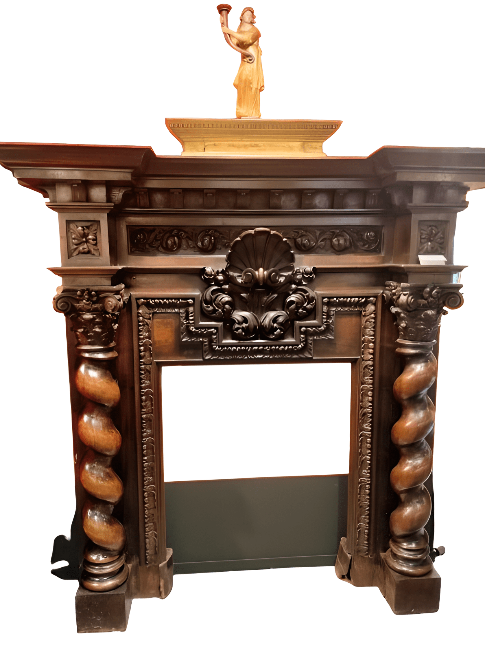 Chimenea de nogal del siglo XVIII con columnas salomónicas, de estilo europeo.