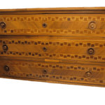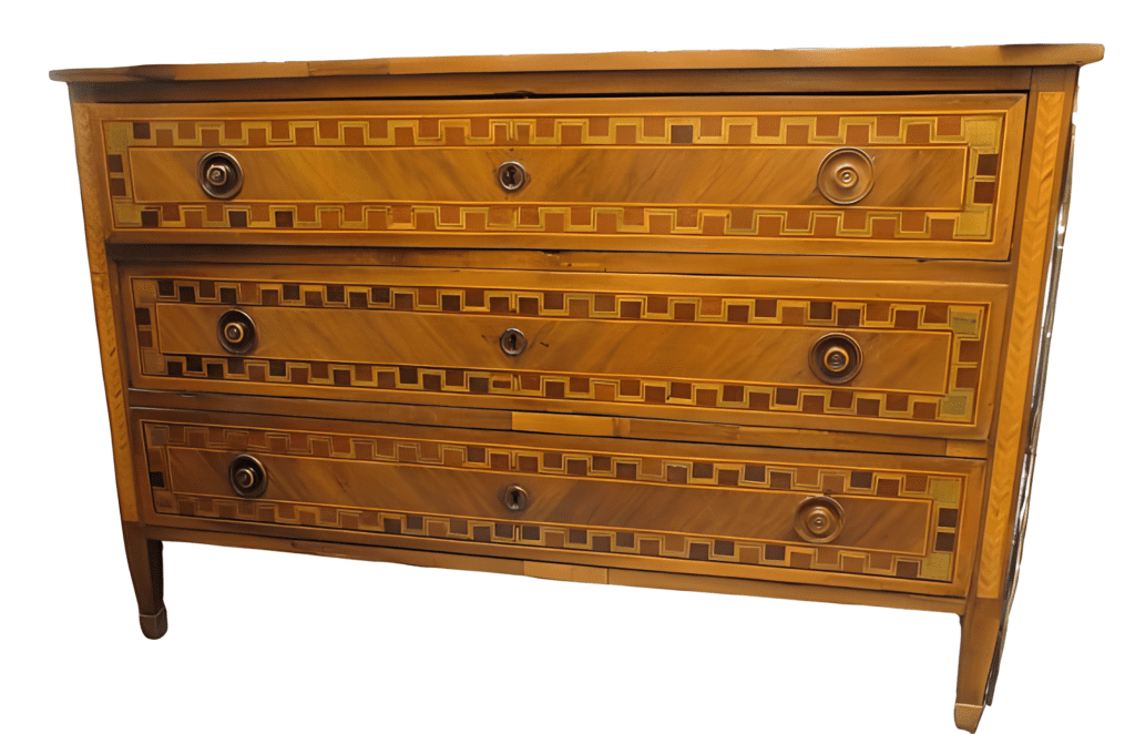 Cómoda de raíz de nogal con marquetería frontal y lateral de palo verde de caoba, palo rosa y limoncillo, del siglo XVIII.