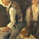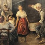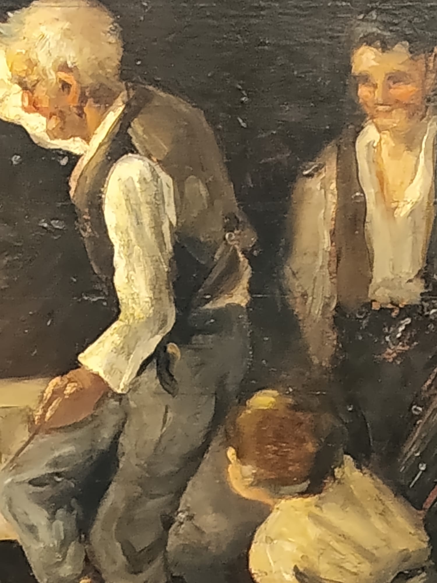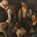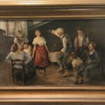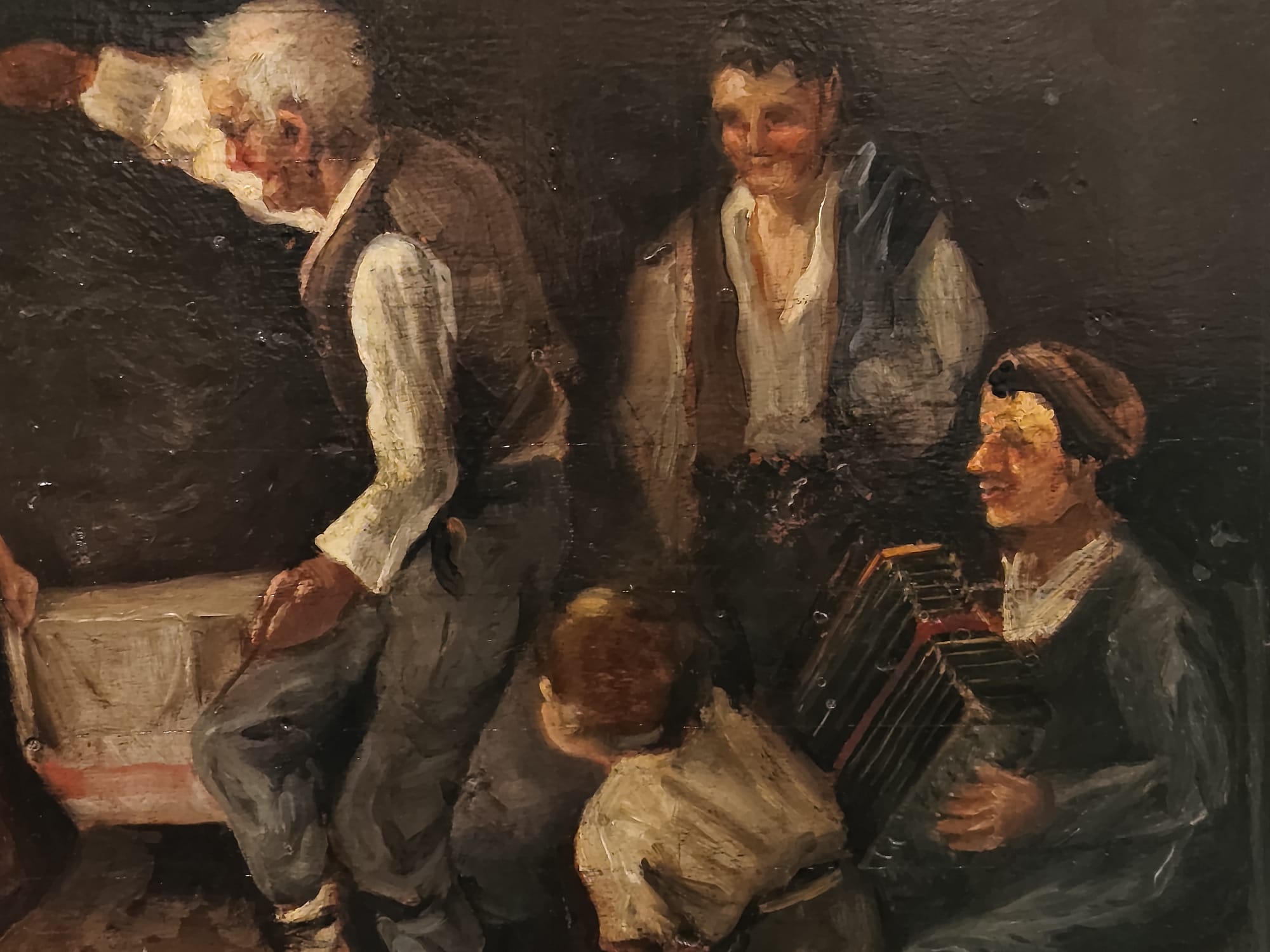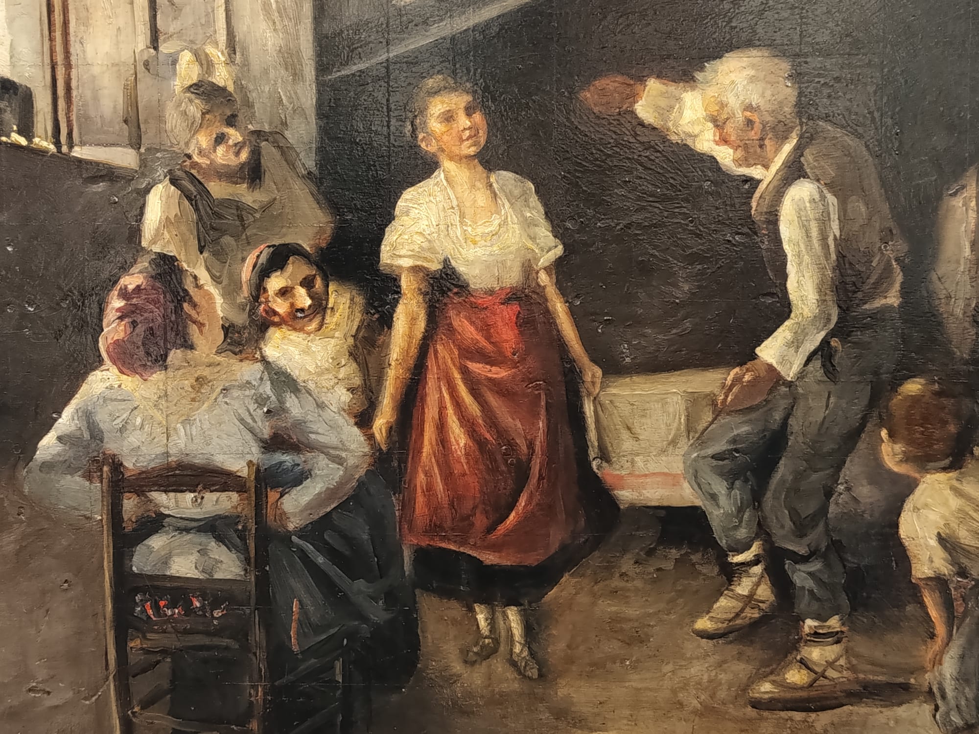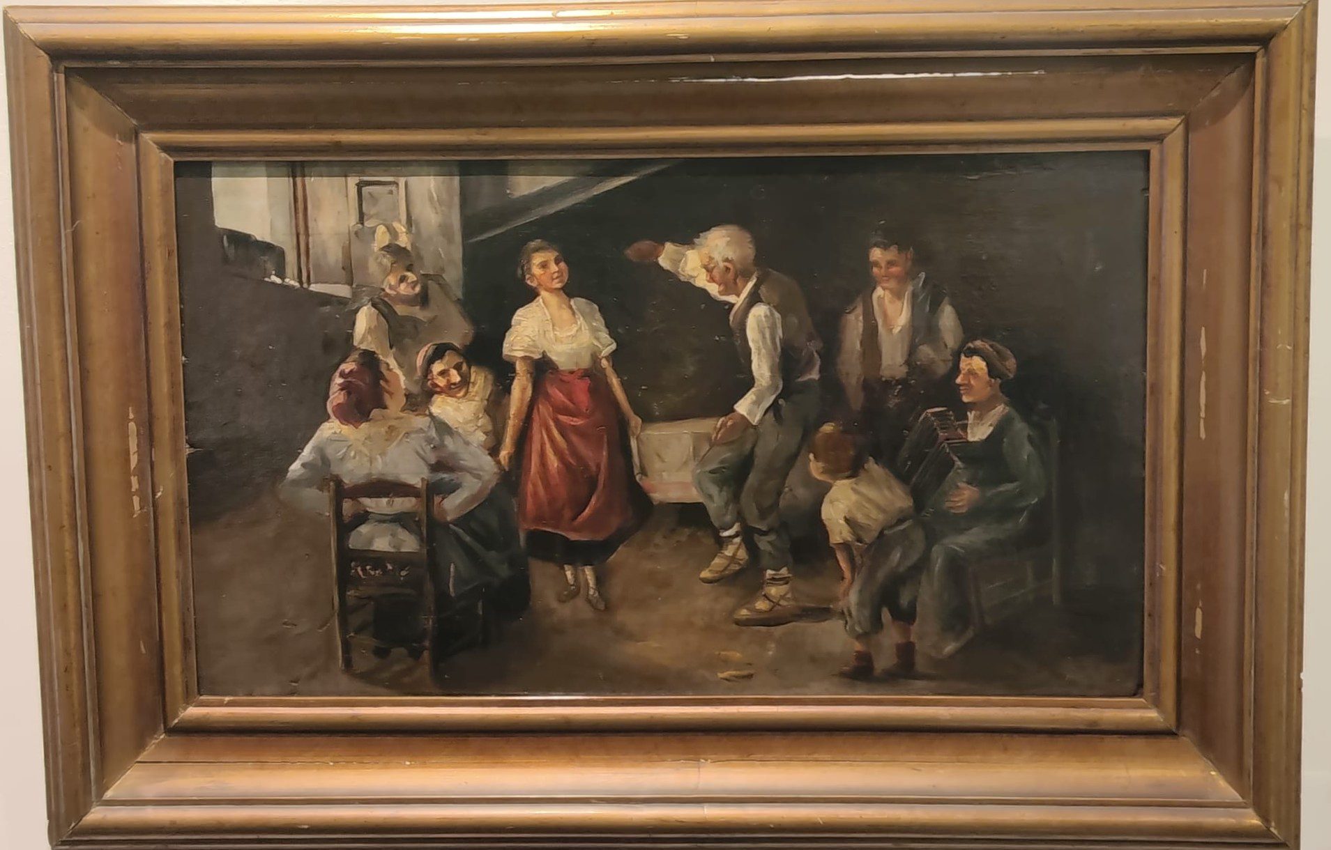 Óleo sobre tabla que representa una fiesta en un caserío con baile y música realizado por Pablo Uranga (1861-1934).