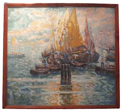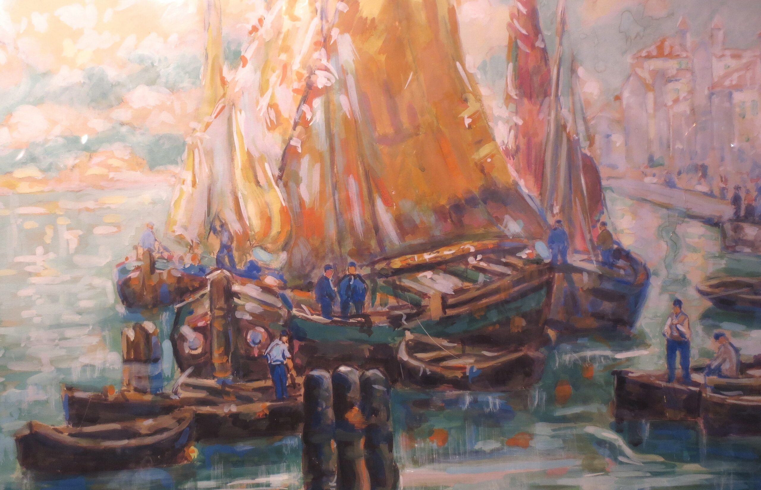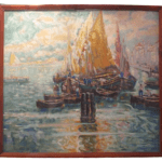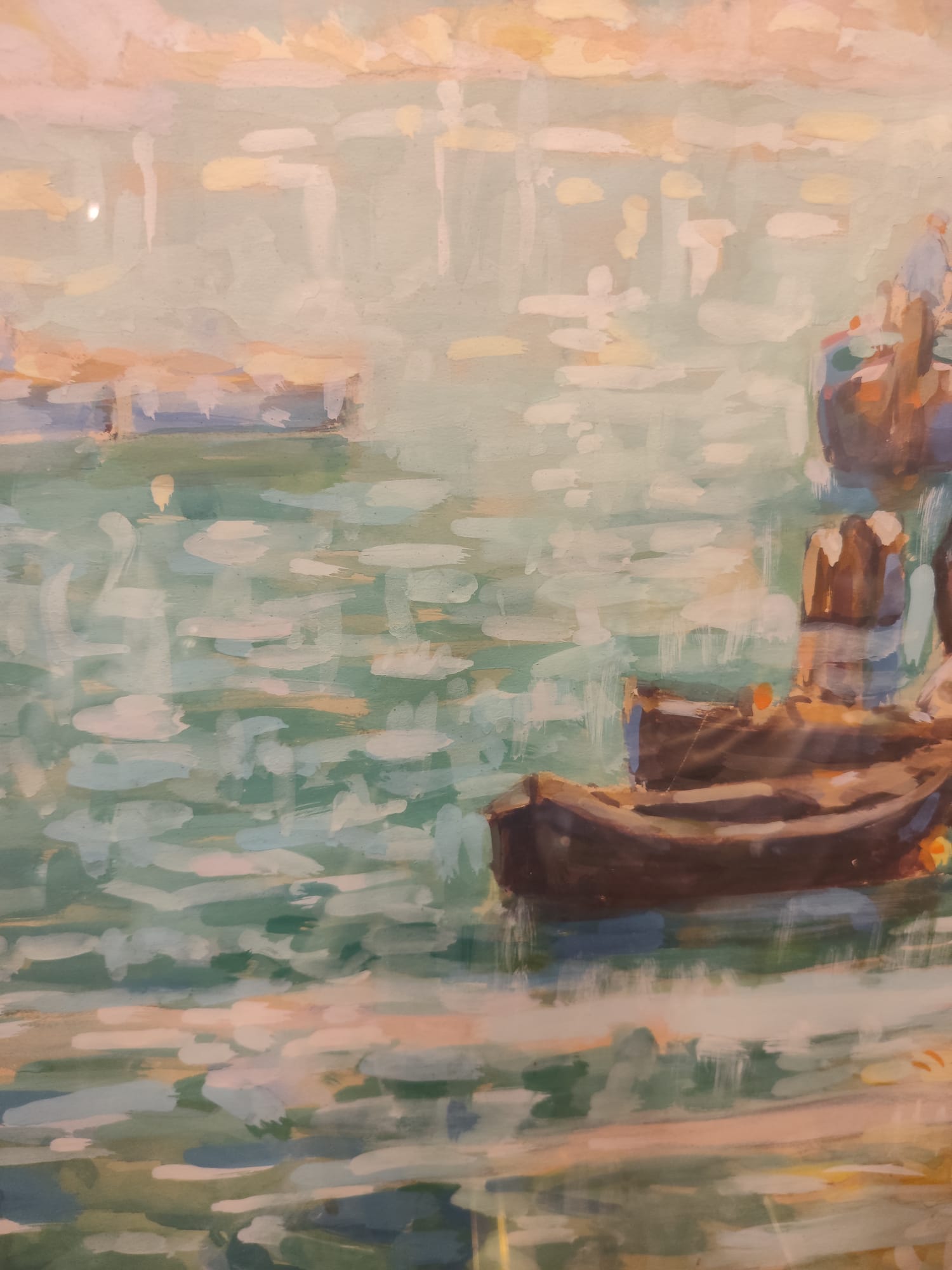 Acuarela con técnica impresionista o postimpresionista del pintor británico Harold Harvey (1874-1941), con pinceladas visible y vibrantes, centrada en el efecto de luz; finales del siglo XIX y principios del siglo XX.