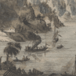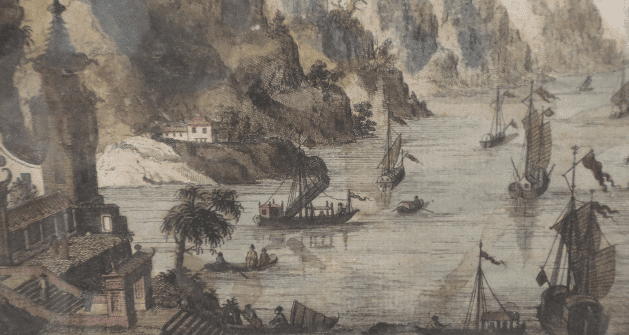 Grabado a color realizado a mano que representa un paisaje exótico (río Pe Kiang en China), estilo chinoiserie, del siglo XVIII.