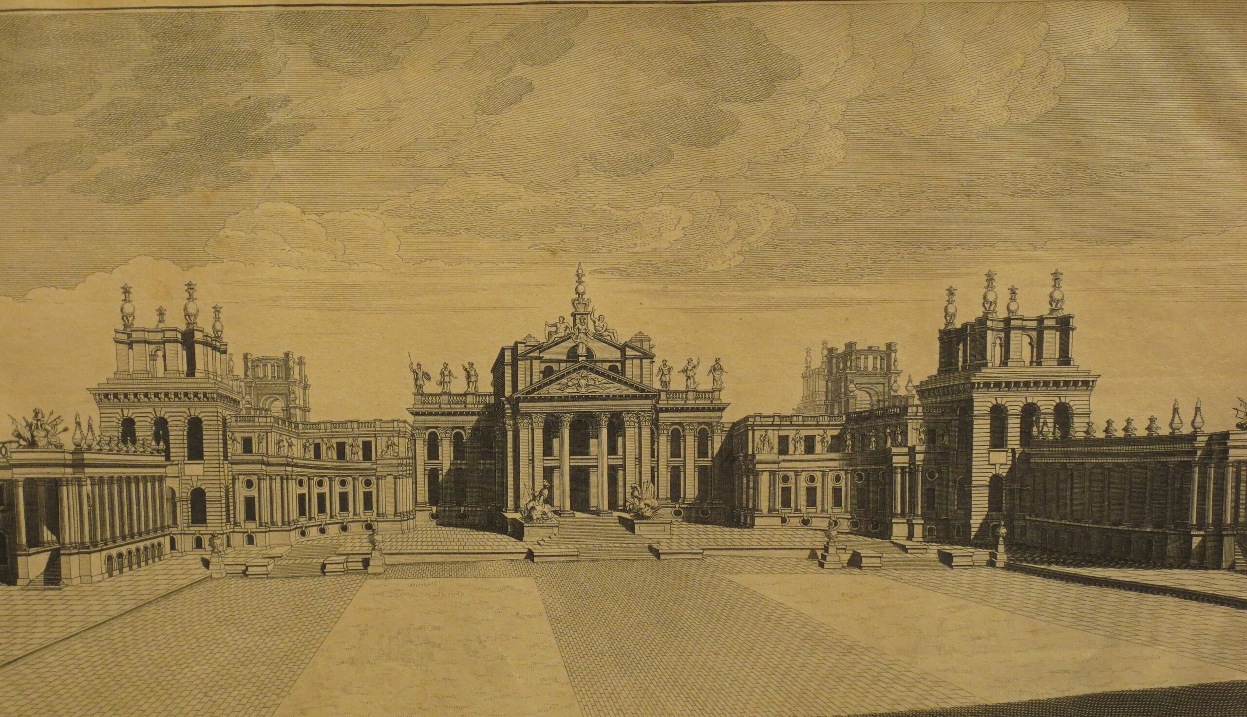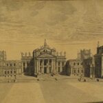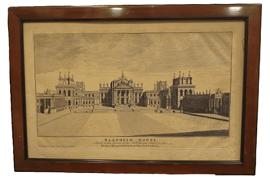 Grabado de edificio histórico británico realizado por Alex Hogg en el siglo XVIII.