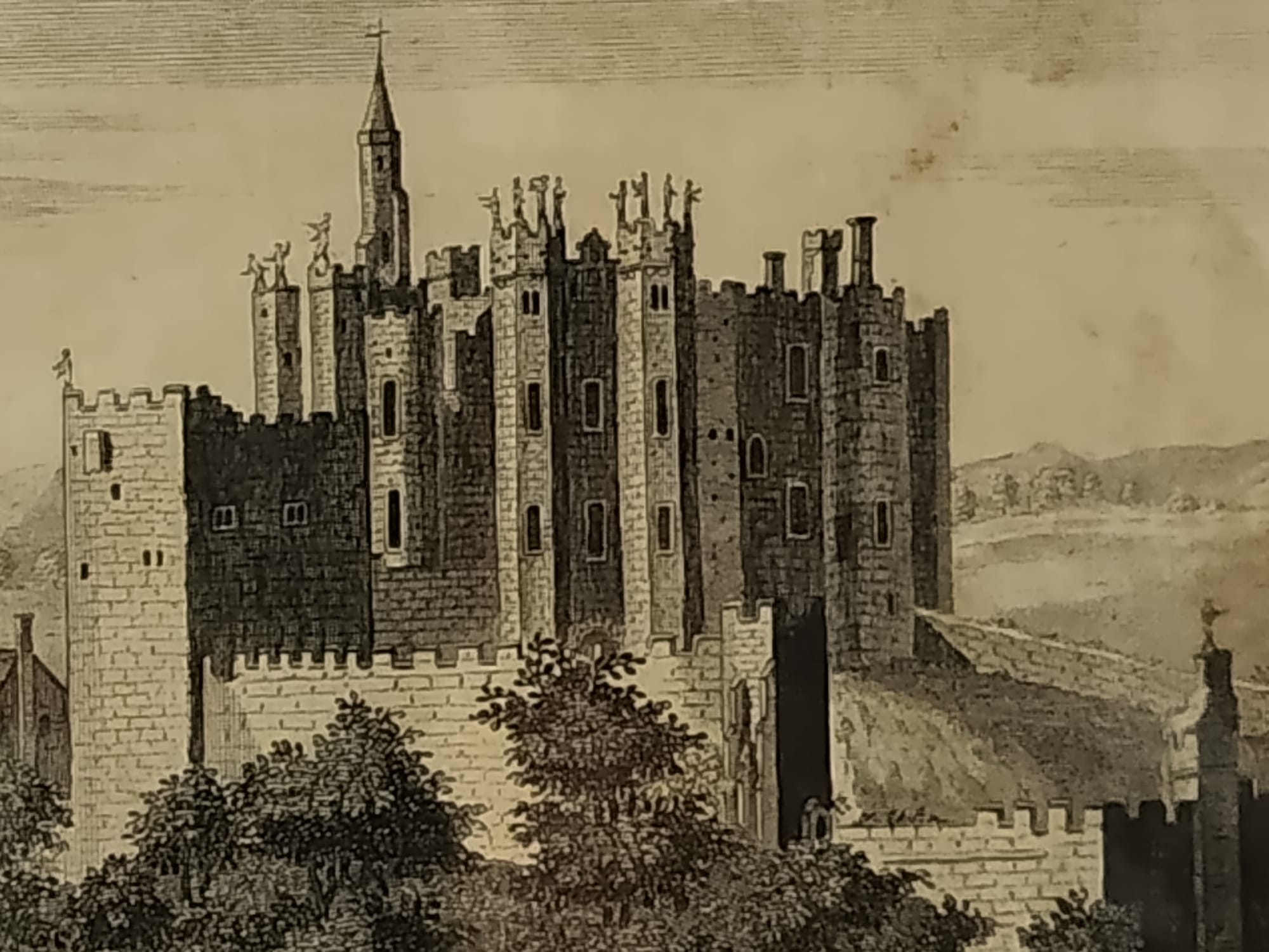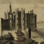 Grabado de edificio histórico británico realizado por Alex Hogg en el siglo XVIII.