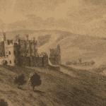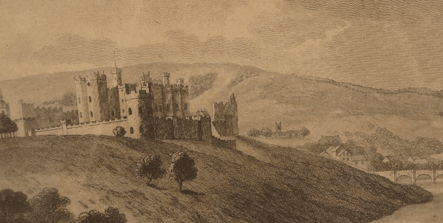 Grabado de edificio histórico británico realizado por Alex Hogg en el siglo XVIII.