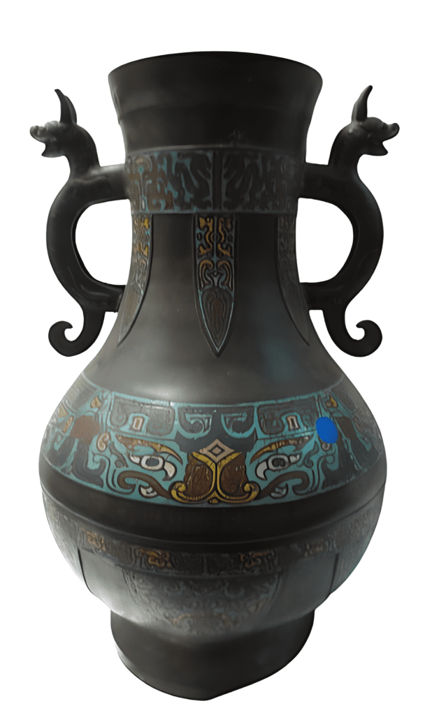 Jarrón chino de bronce con asas en forma de dragón con decoración esmaltada, estilo cloisonné del siglo XIX.
