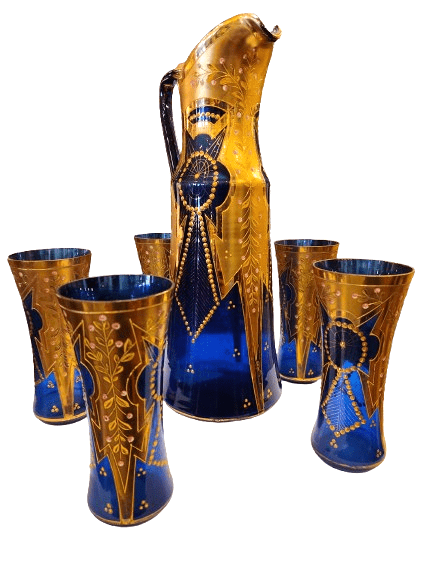 Juego de jarra de cristal de Murano con cuatro vasos, decorada a mano con oro del siglo XIX.