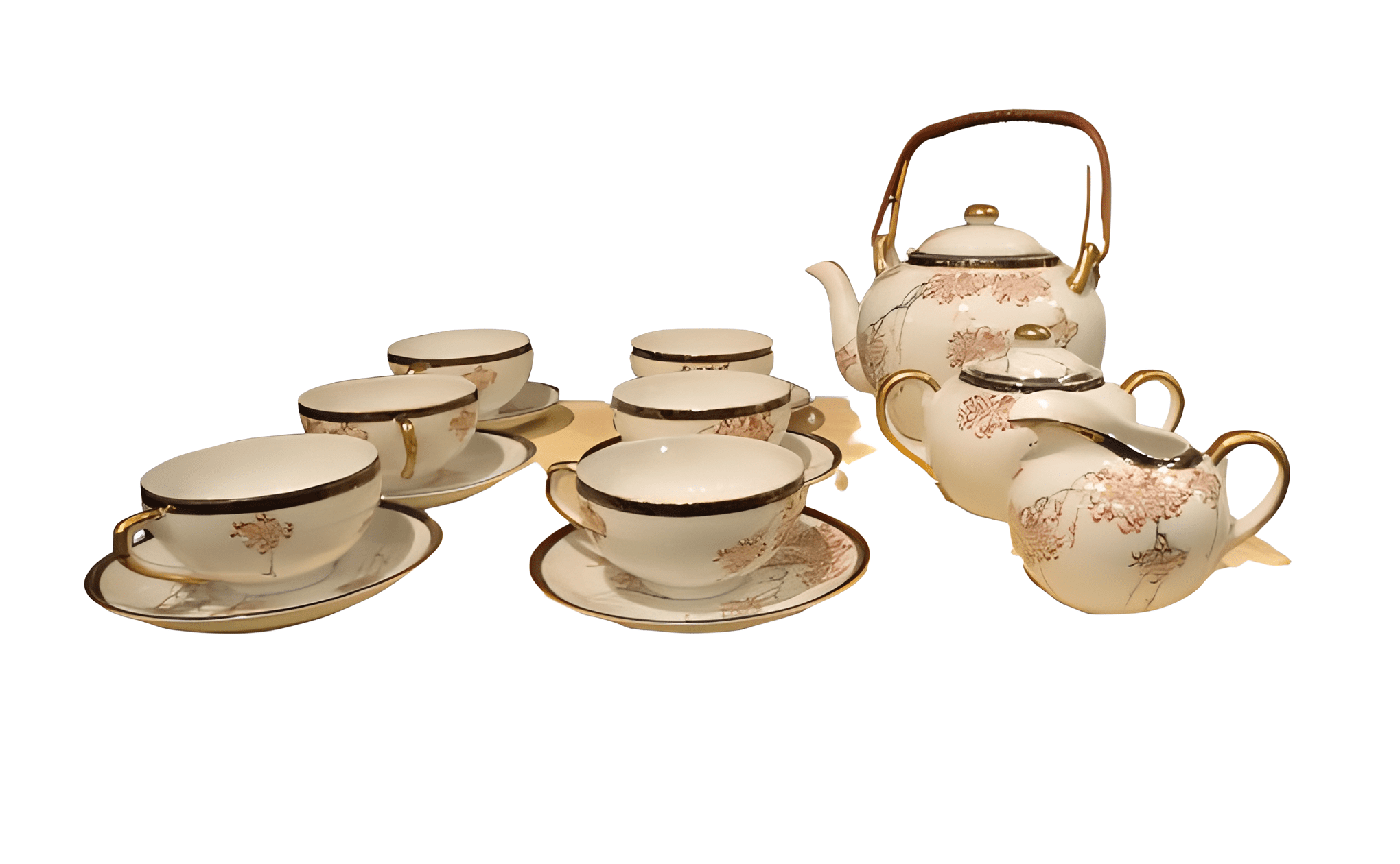 Juego de té japonés de porcelana fina; a contraluz en las tazas se puede ver a una mujer, probablemente del siglo XX.