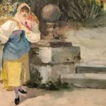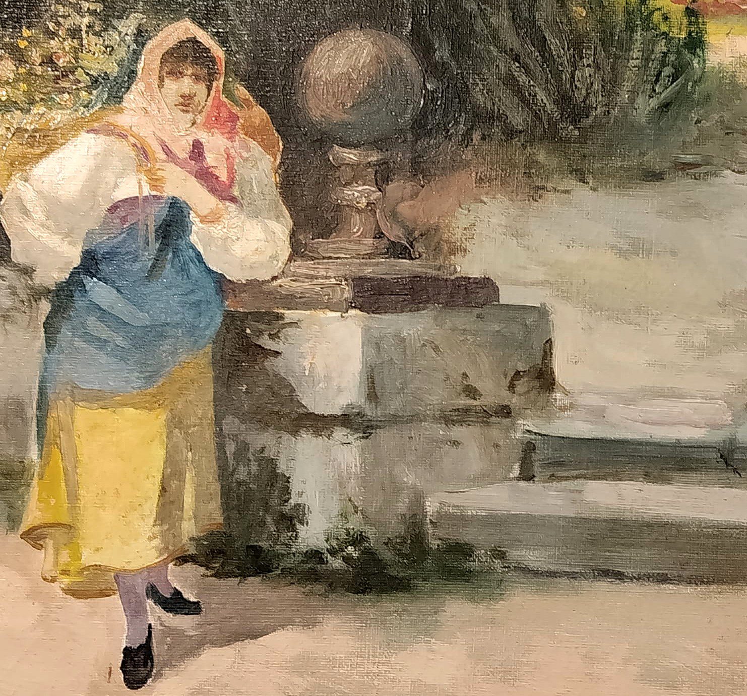 Óleo sobre lienzo que representa a una mujer con flores en una cesta de mimbre, realizado por Emilio Álvarez Díaz (1879-1952), escuela española.