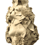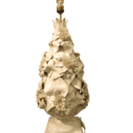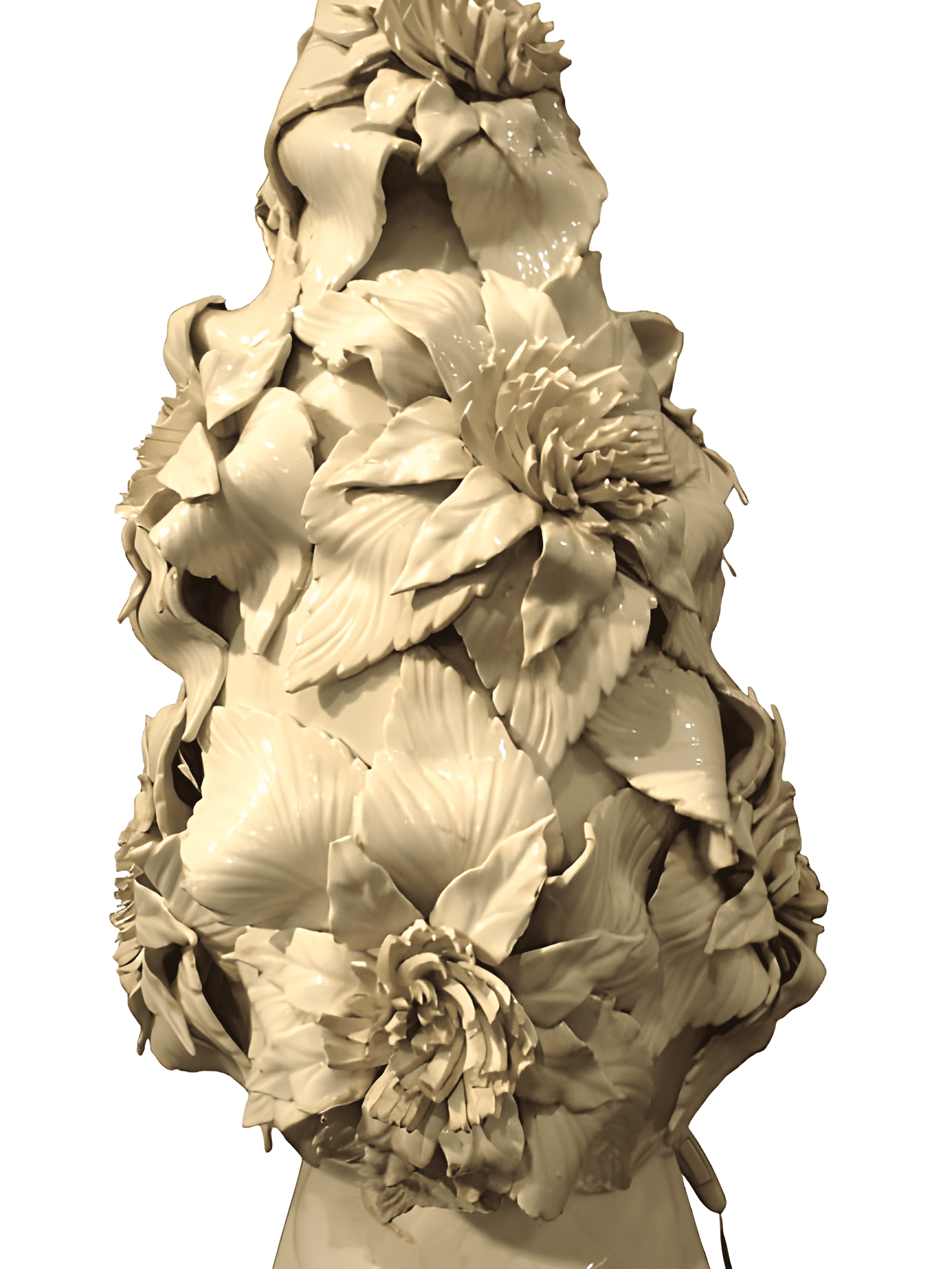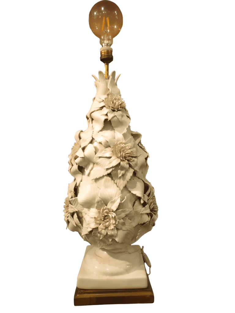 Lámpara de sobremesa de porcelana de Manises, hacía 1950, en color blanco con motivos vegetales.
