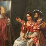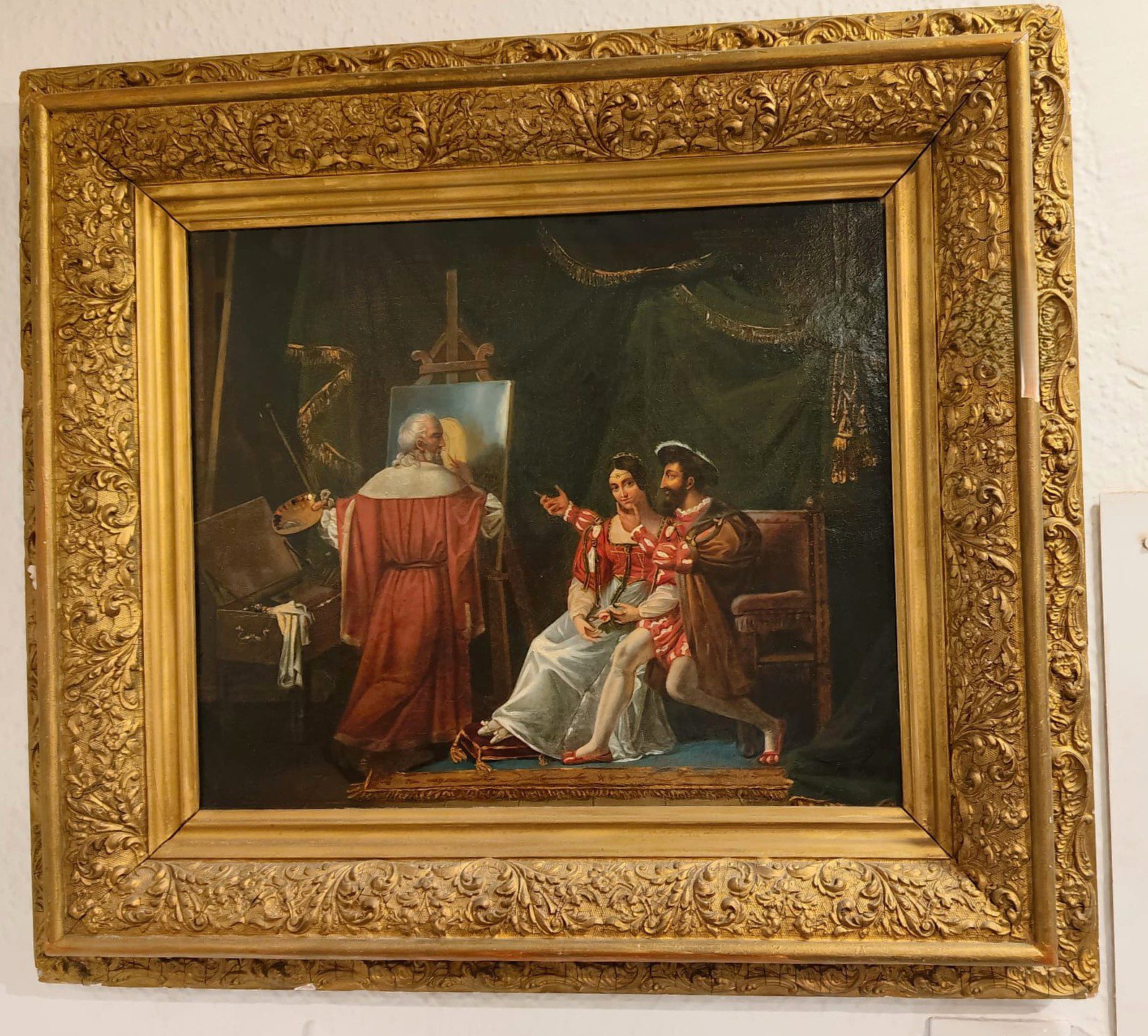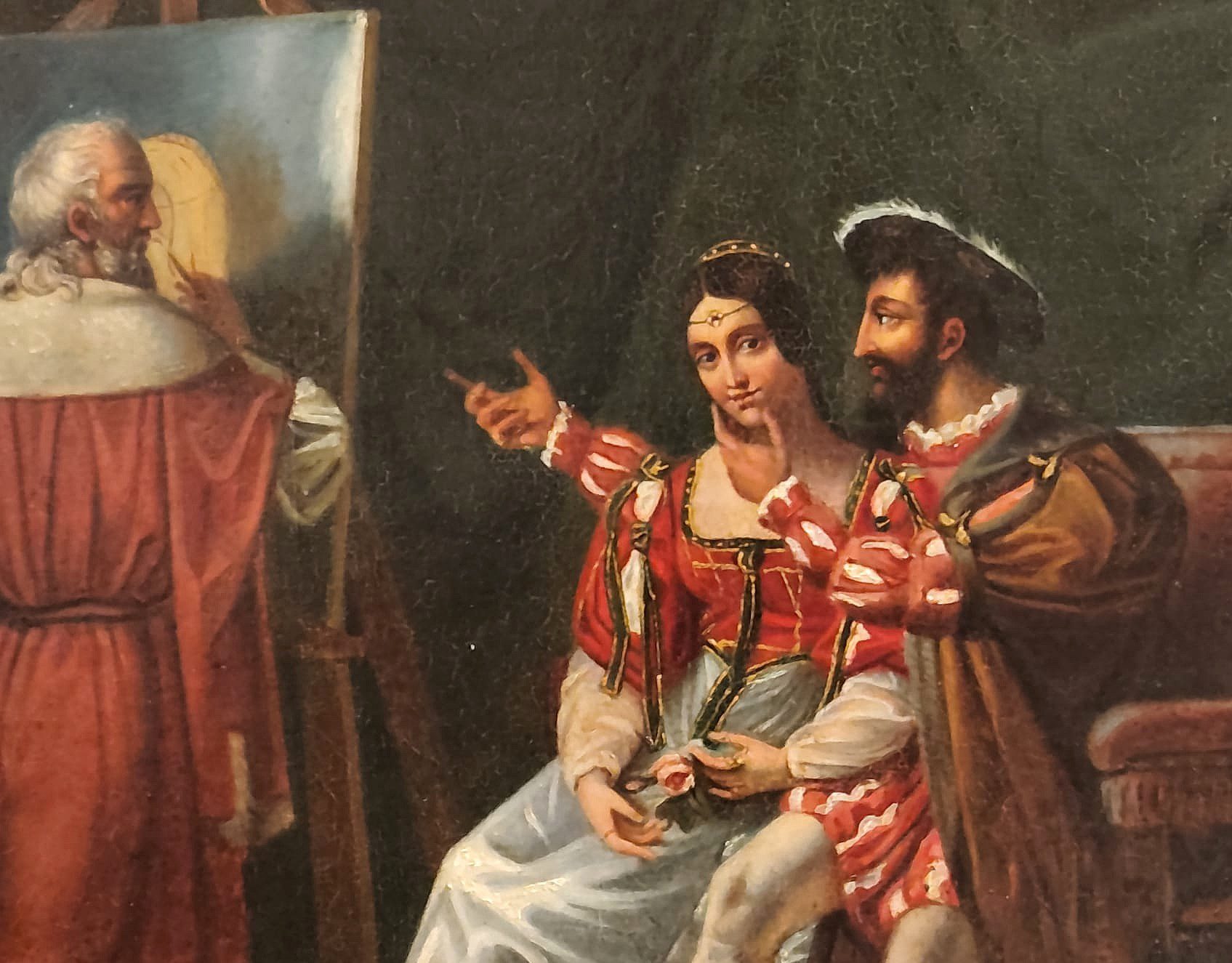 Óleo sobre lienzo que representa a Leonardo Da Vinci pintando a la Gioconda, finales del siglo XVIII, escuela francesa.
