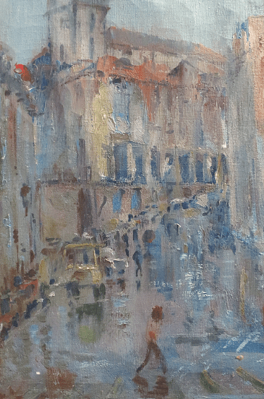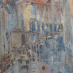 Óleo sobre lienzo que presenta la zona de los Arquillos en Vitoria, realizado por Andrés Apellaniz (1928-2025).