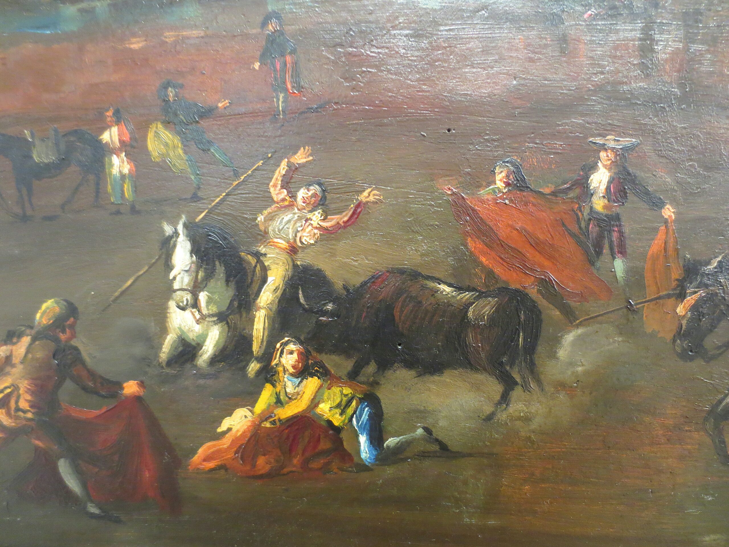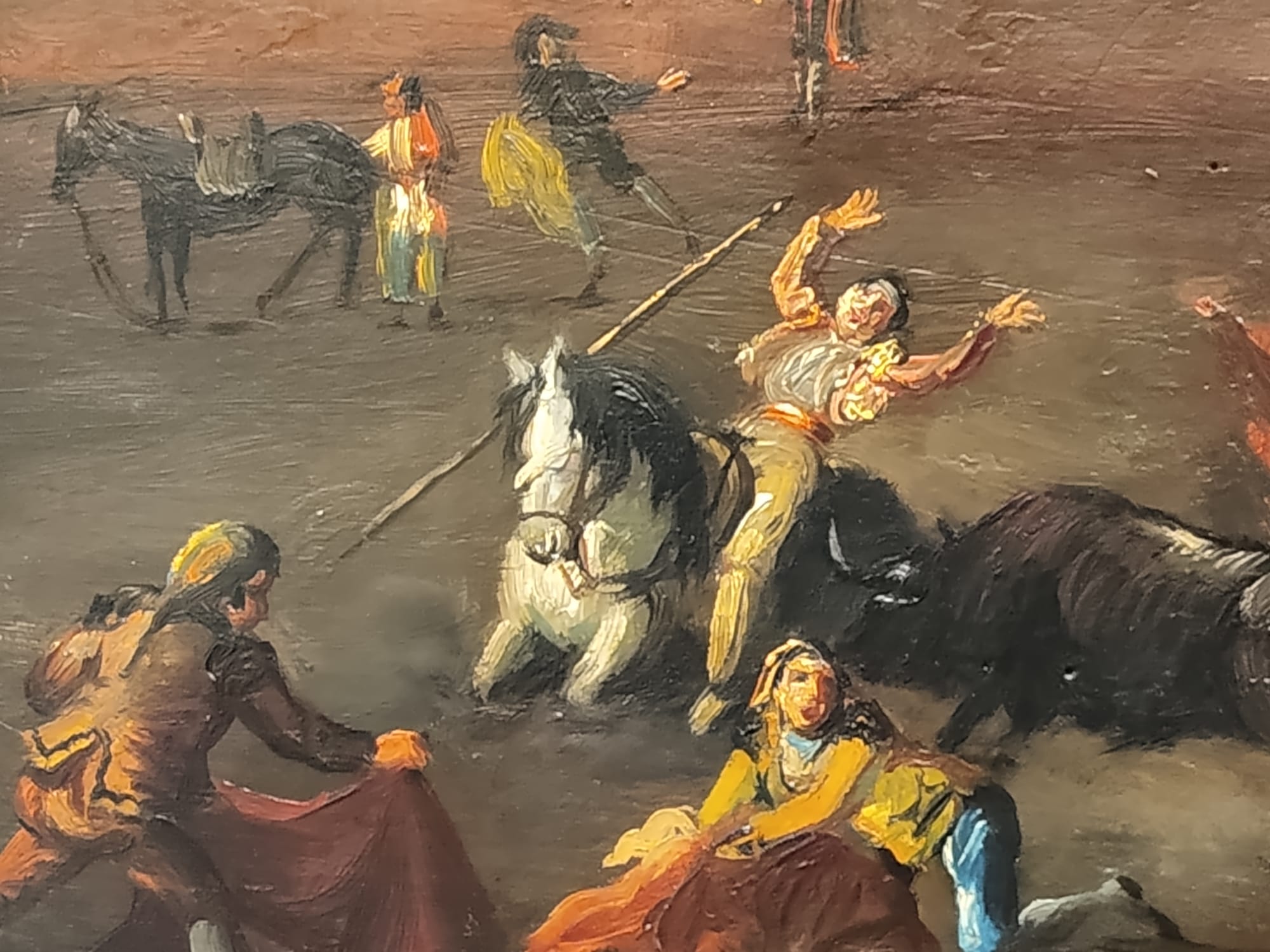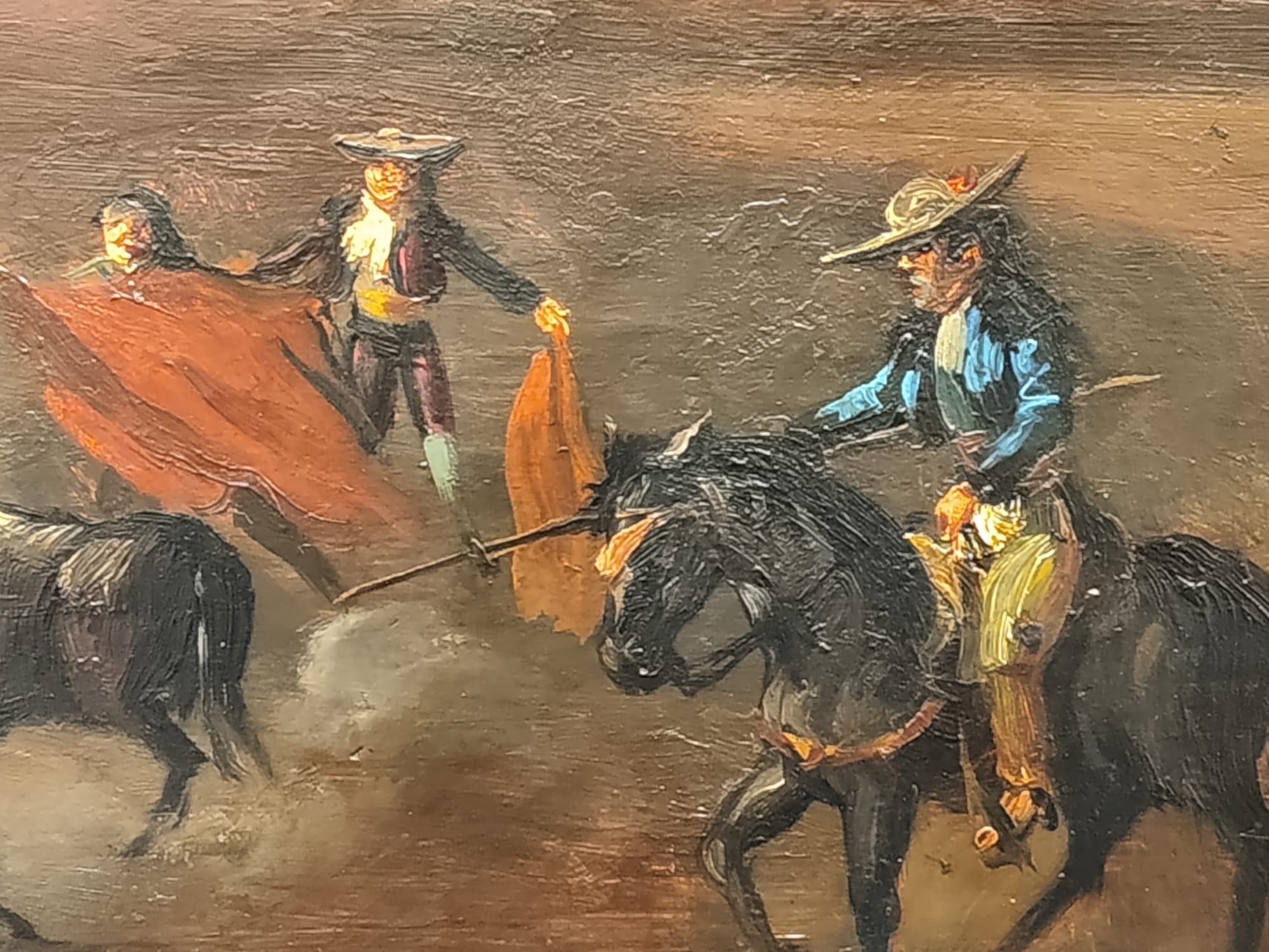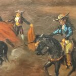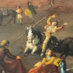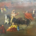 Óleo sobre tabla que representa la muerte acechando al caballo y al rejoneador, realizado por Eugenio Lucas Velázquez (1817-1870).