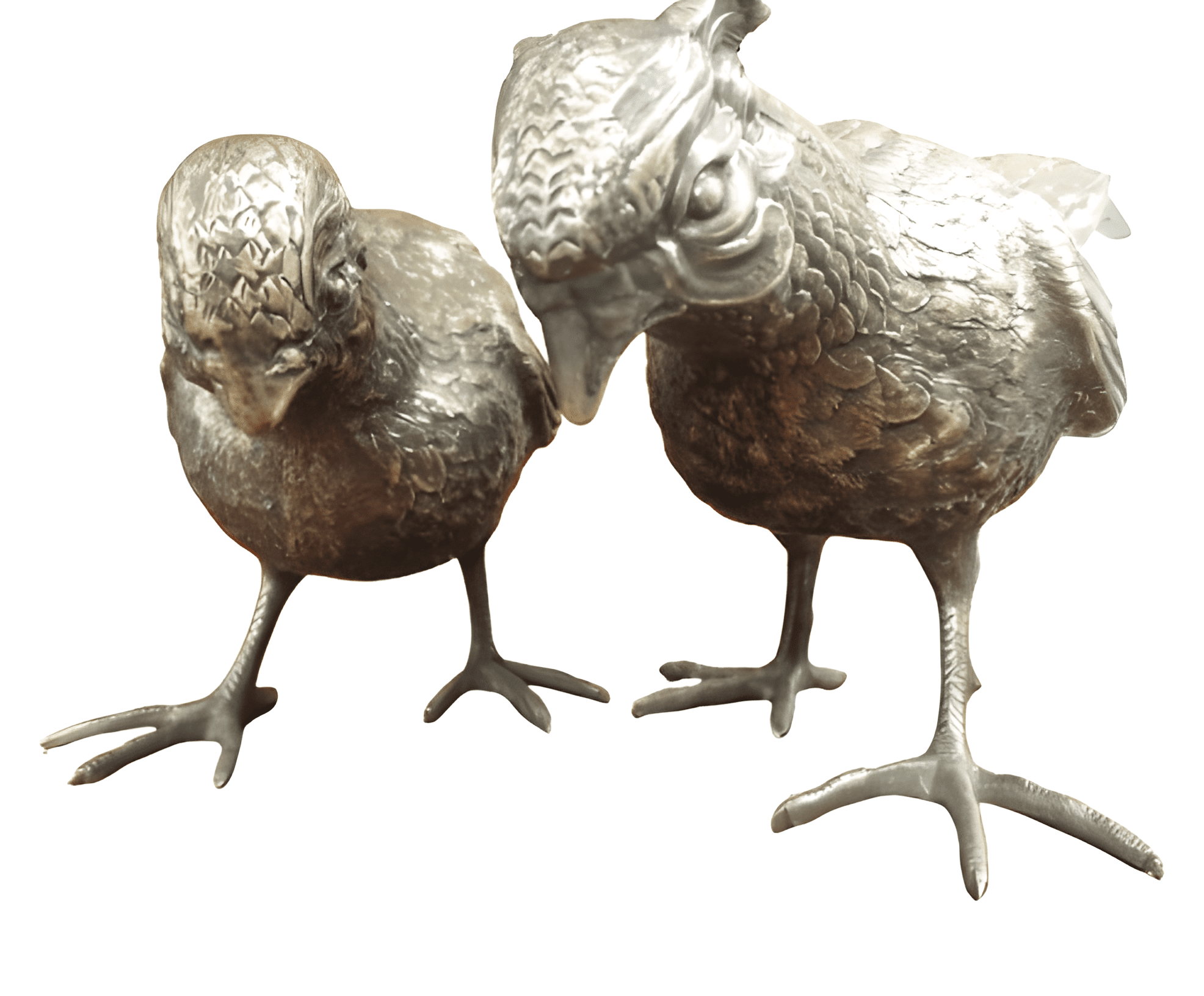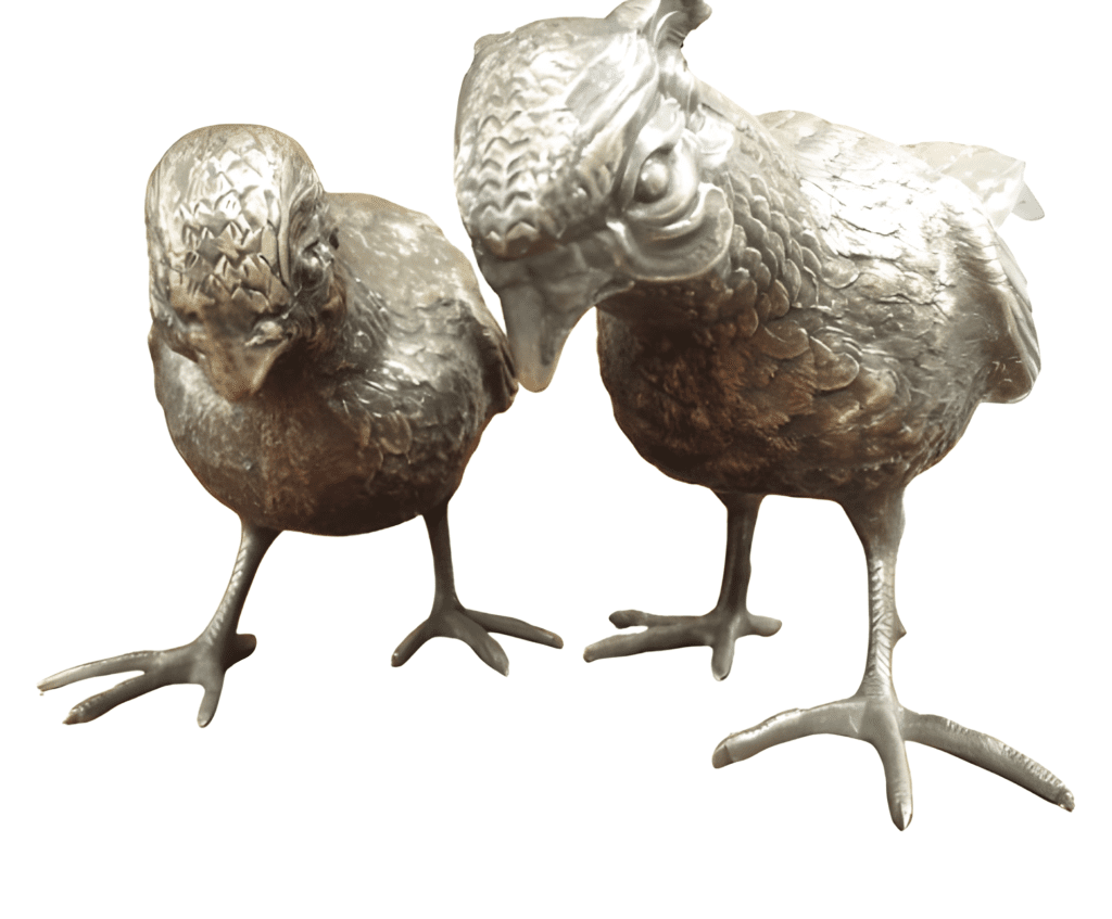 Esculturas representando una pareja de faisanes realizados en alpaca, del siglo XIX.