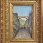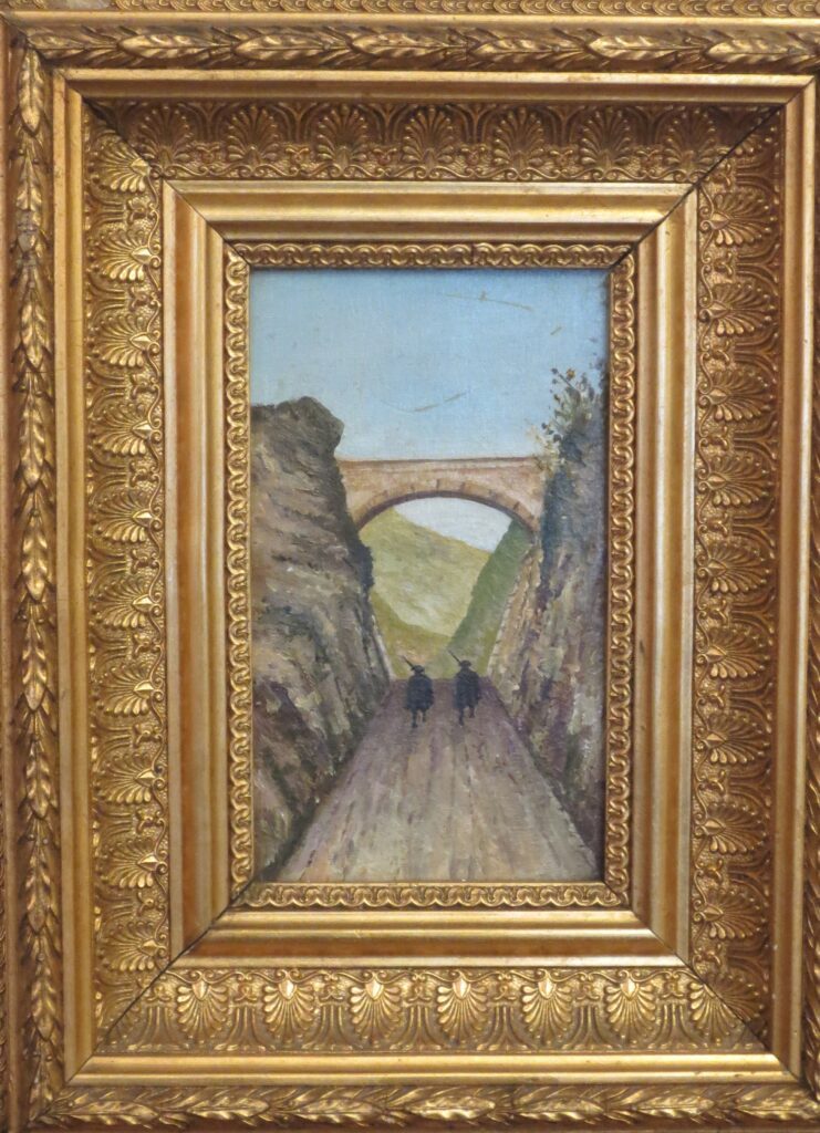 Óleo sobre tabla que representa a una pareja de la guardia civil caminando; de finales del siglo XIX y principios del siglo XX.