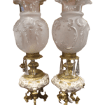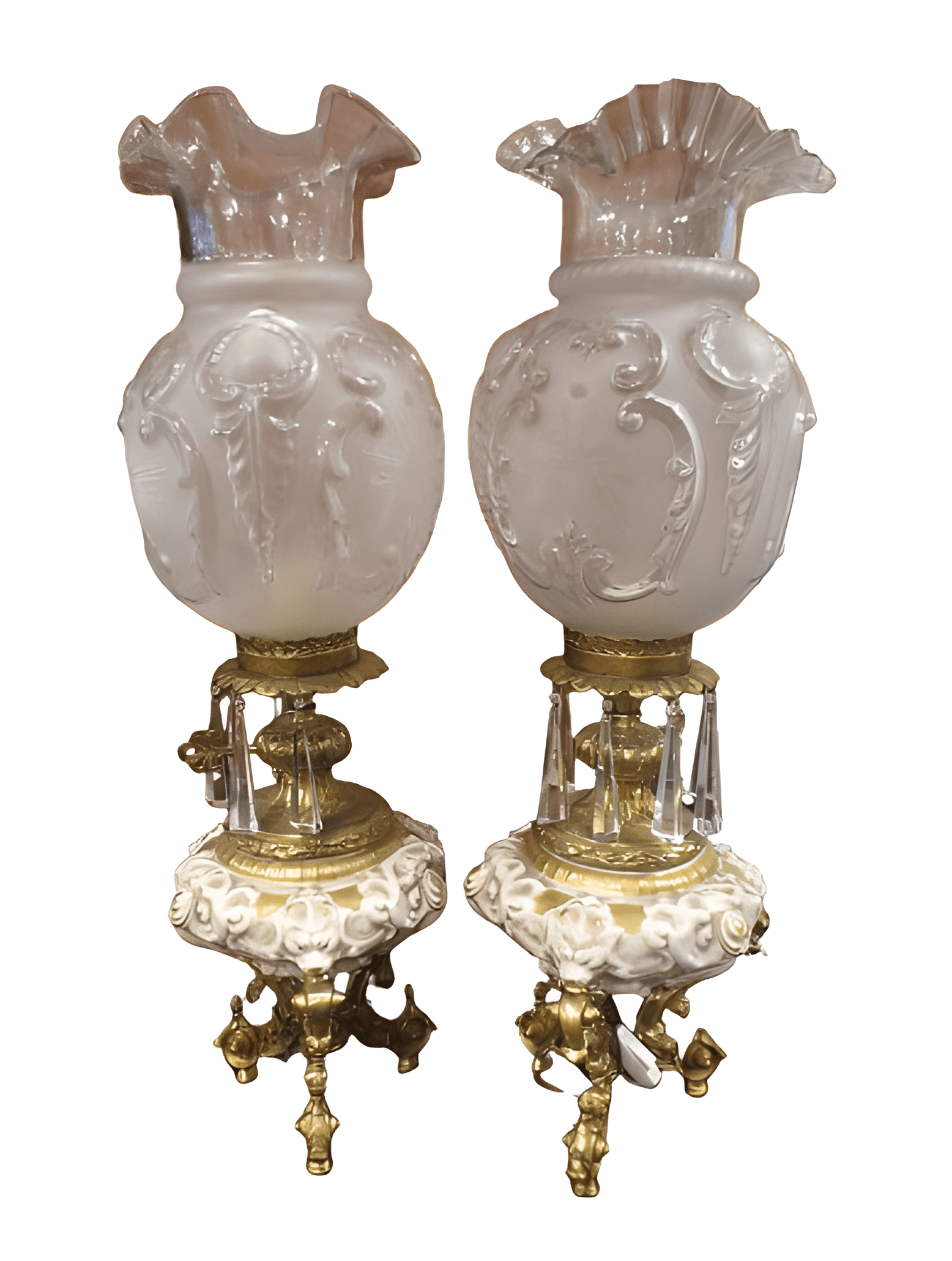 Pareja de lámparas realizadas en cerámica esmaltada llamada «pata choca» con detalles pintados a mano y acabados metálicos y con tulipa de cristal satinada; estilo victoriano del siglo XX.