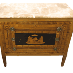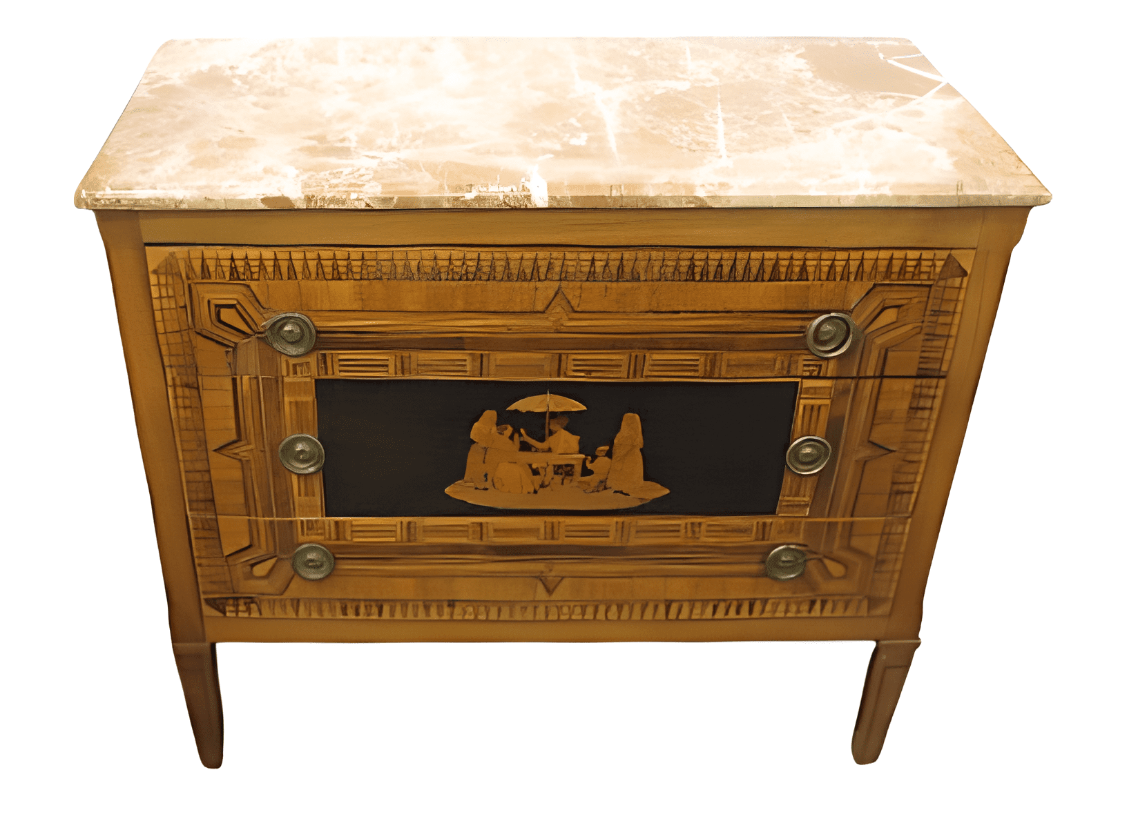 Cómoda realizada de encargo de raíz de nogal con marquetería de ébano, limoncillo, caoba y mármol en la parte superior mostrando una escena romántica del siglo XIX.