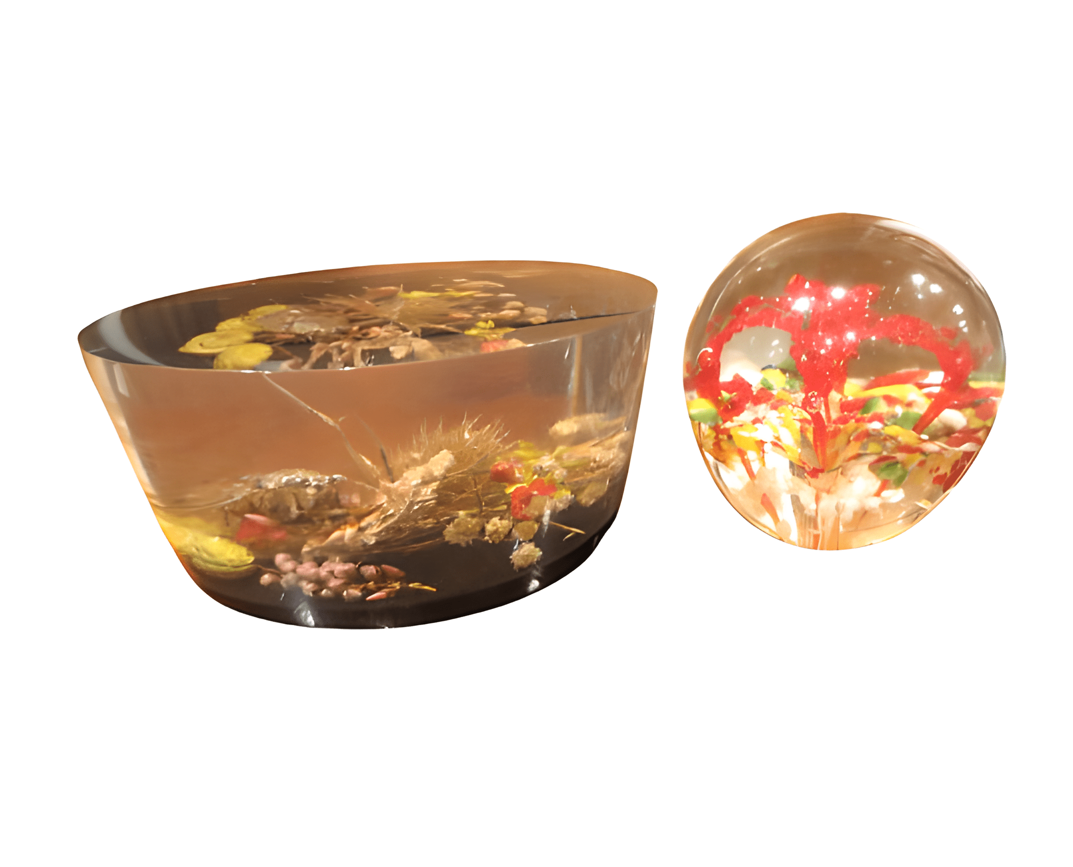 Dos pisapapeles pequeños realizados el grande en resina y el pequeño en cristal del siglo XX.