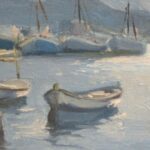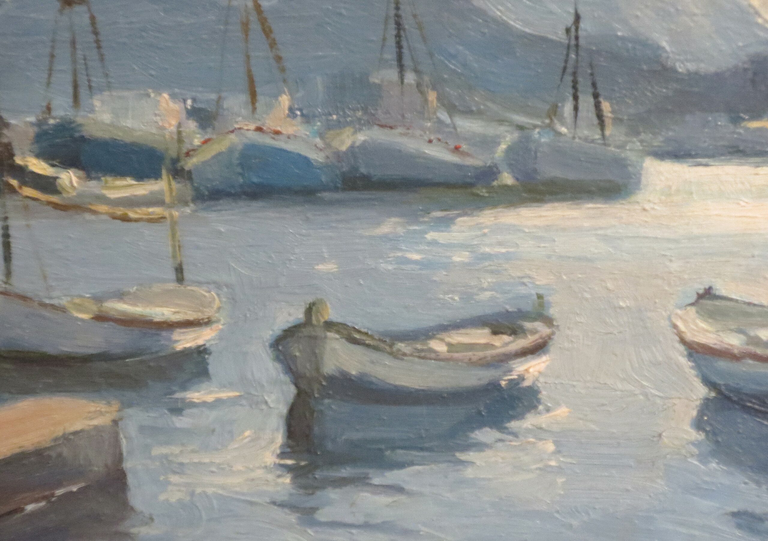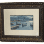 Óleo sobre tabla que representa a una puerto pesquero realizado por Ricardo Sacristán Arrieta (1921-1981).