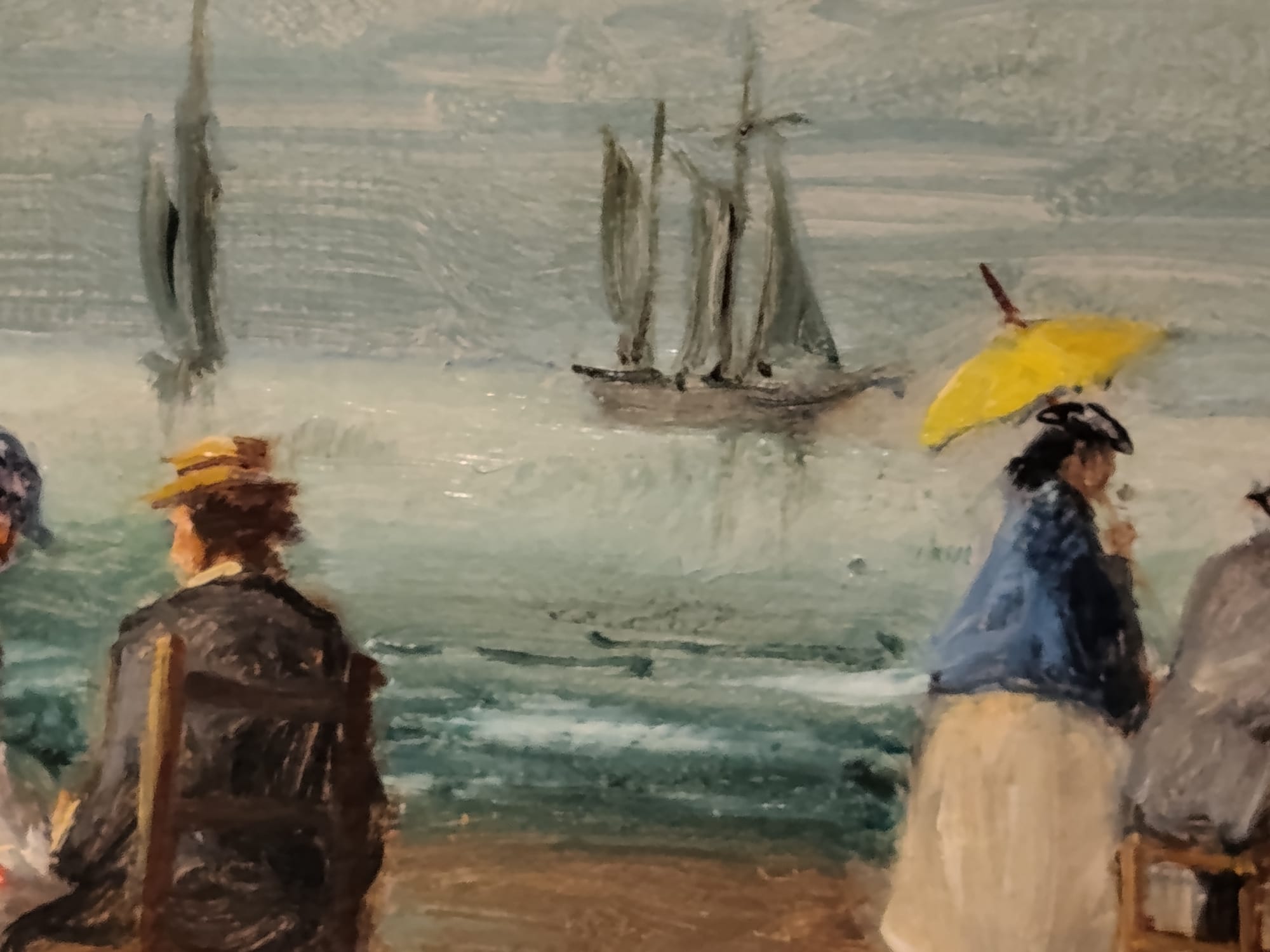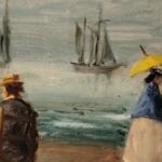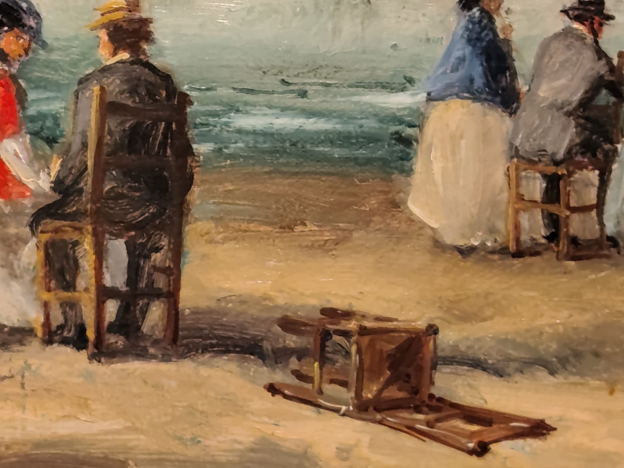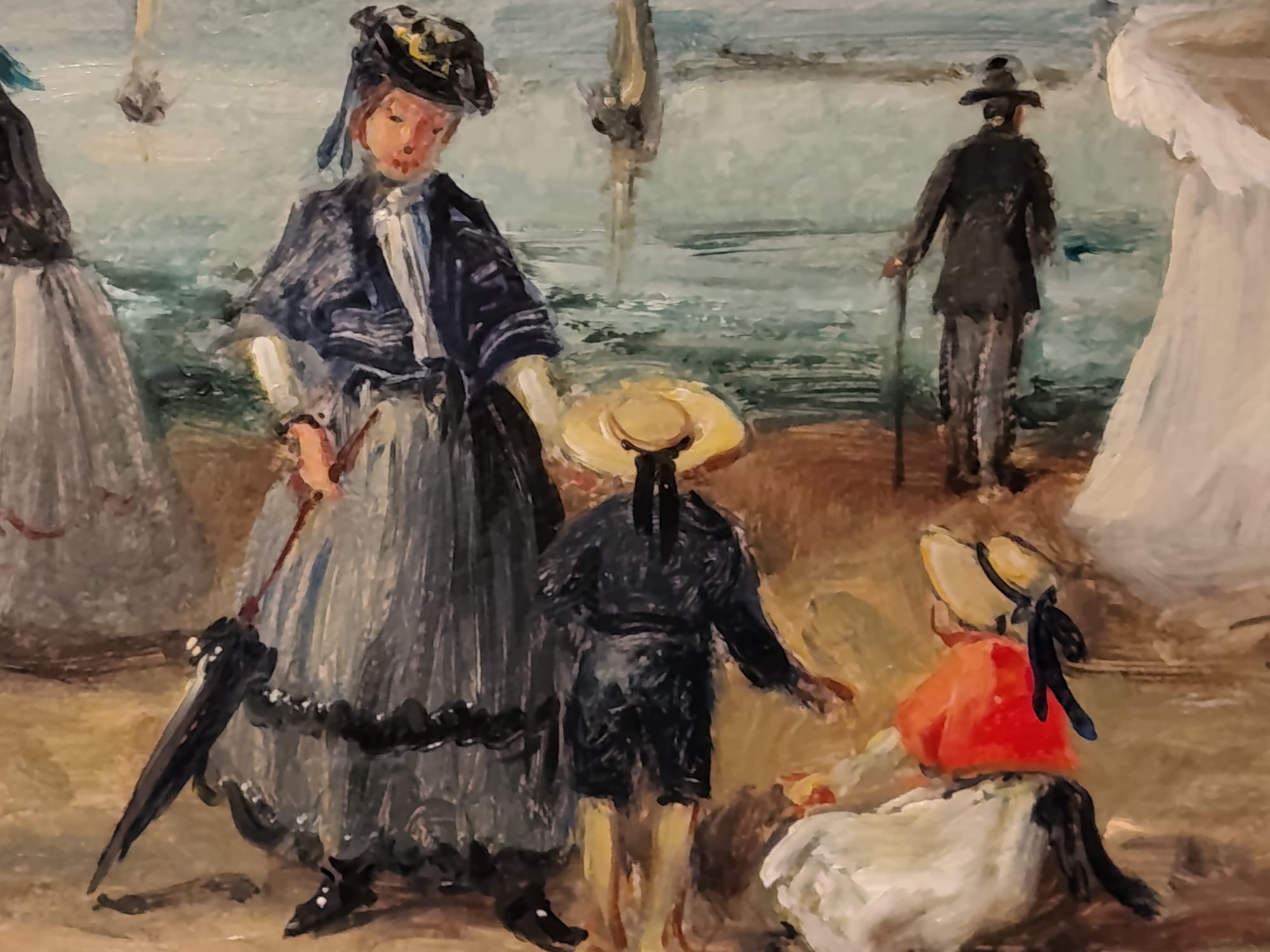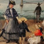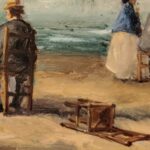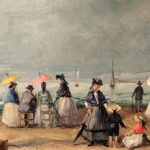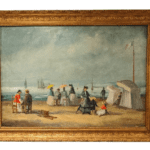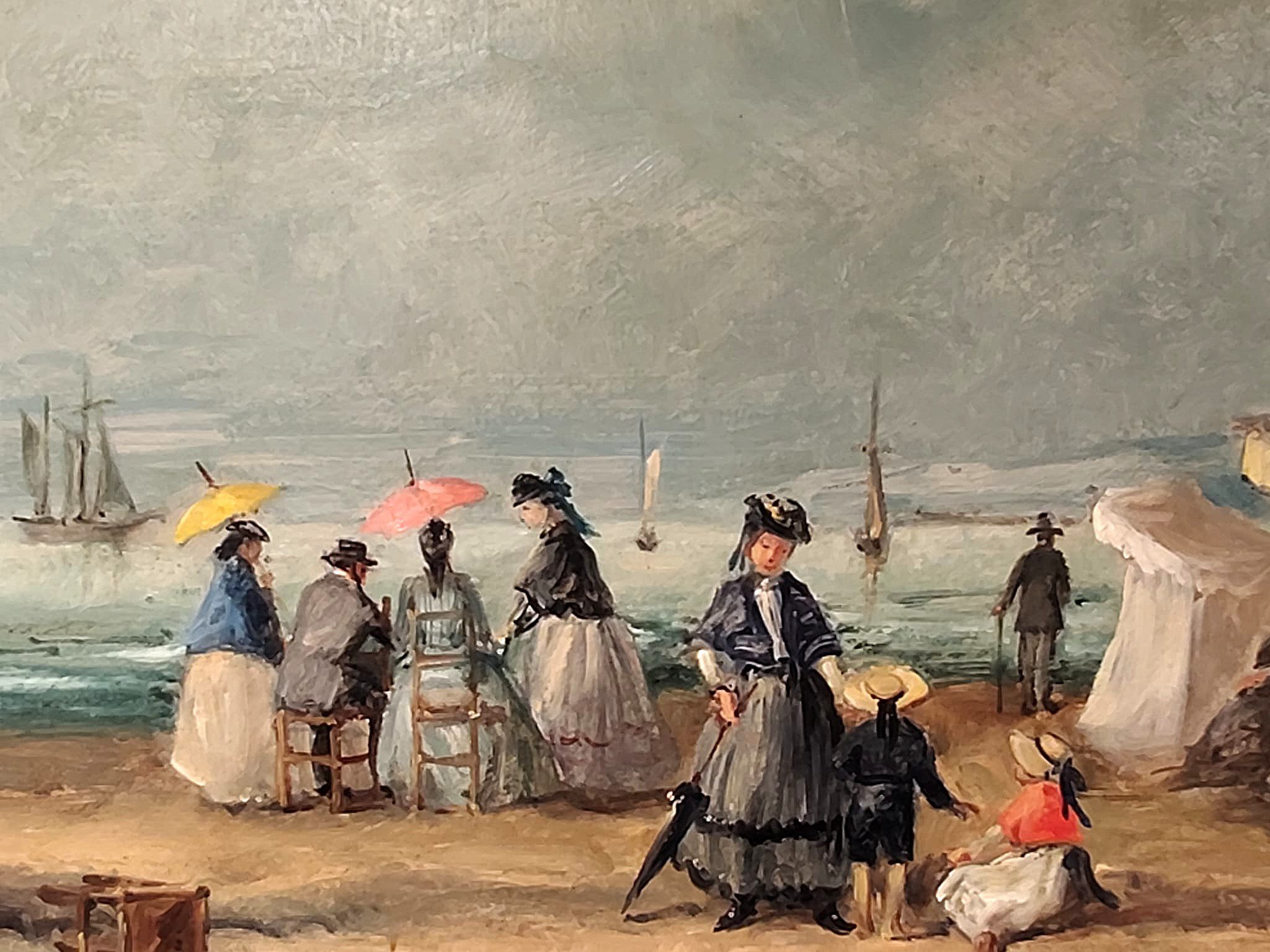 Óleo sobre lienzo que representa a varios personajes en la playa, atribuido a Eugéne Boudin ( 1824-1898).