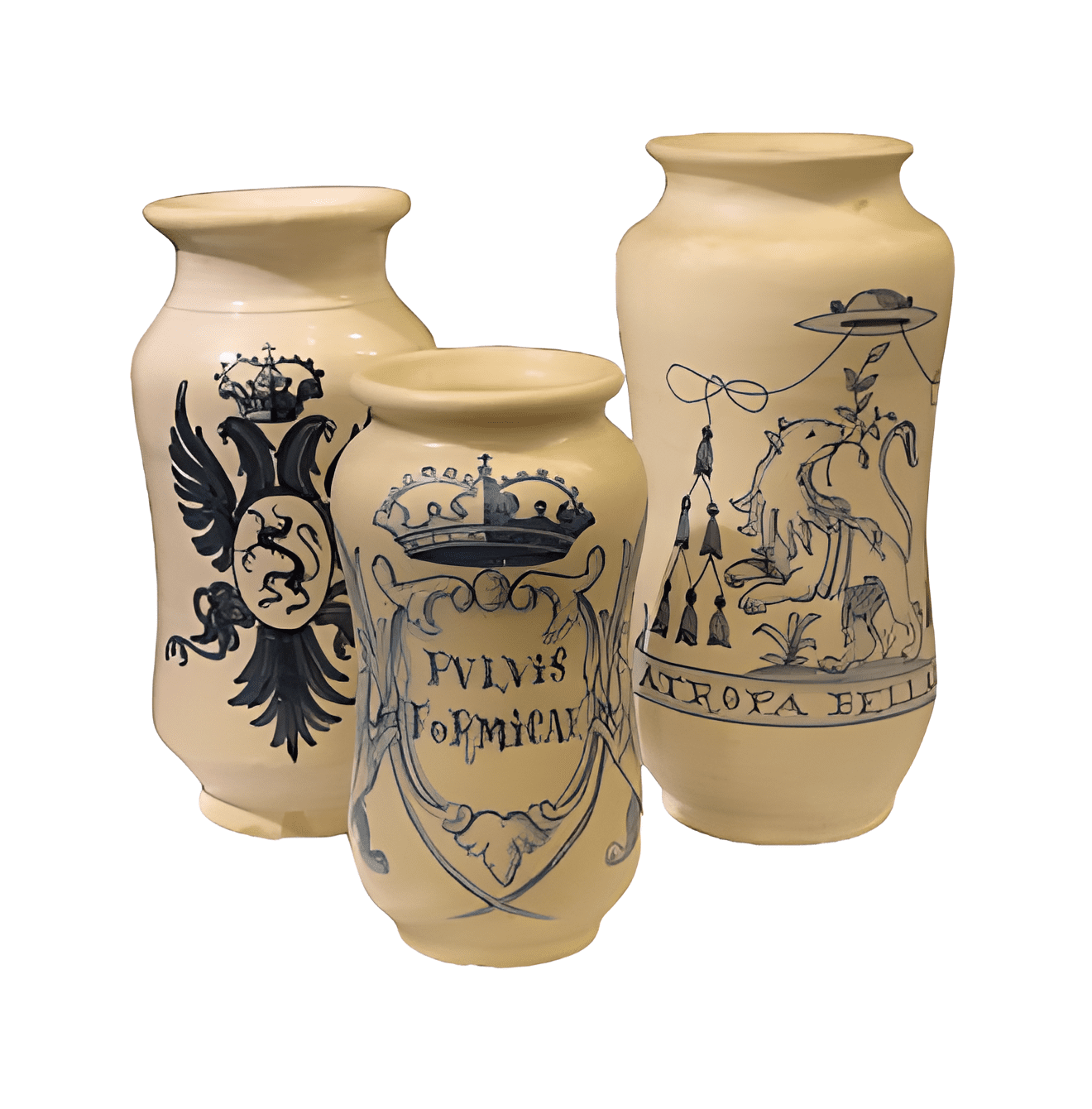 Las medidas de estos tarros son: 21 cm x 10 cm (Corde Cervi ), 28 cm x 12 cm (Atropa Belladona), 26 cm x 12 cm (Águila Bicéfala) aprox.
