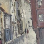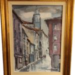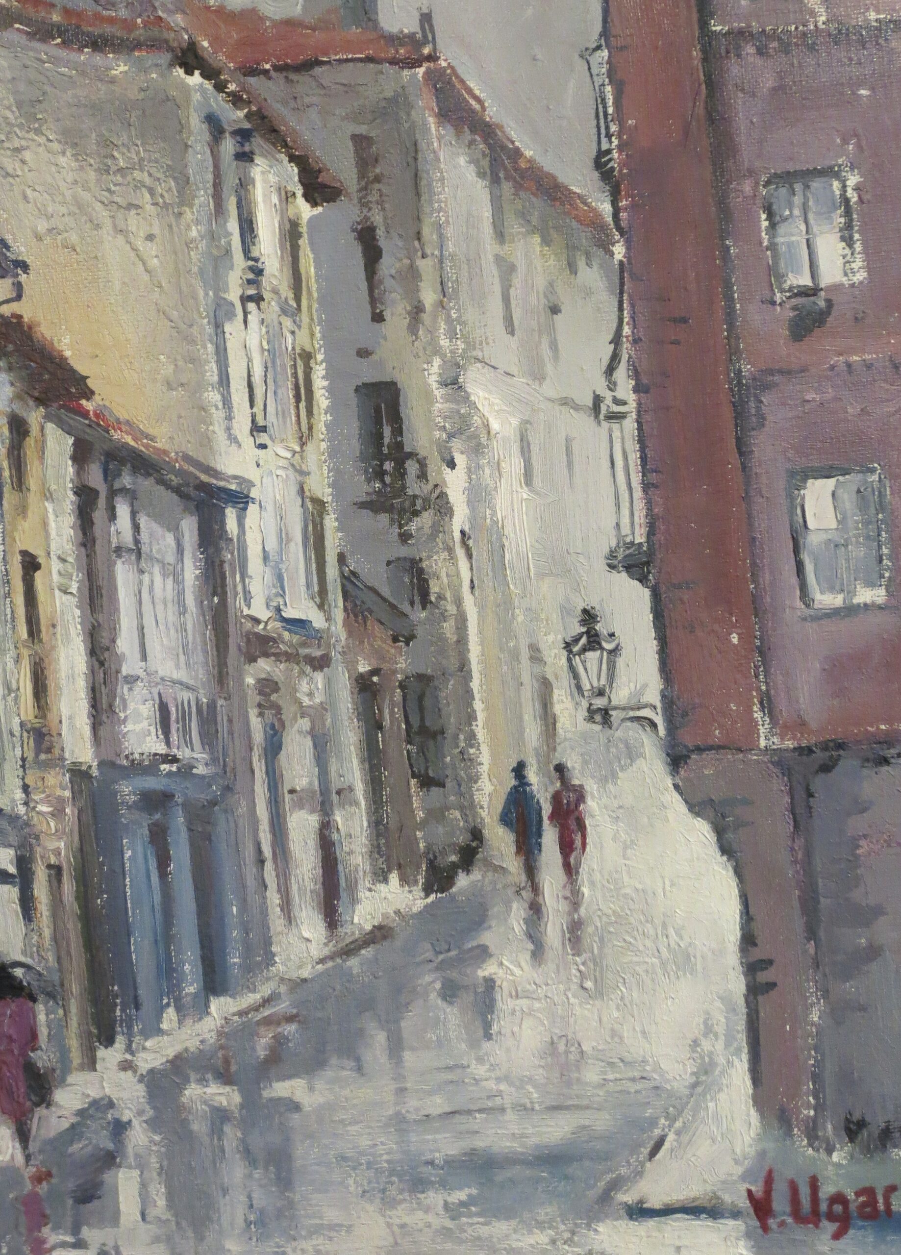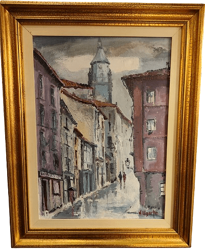 Óleo sobre lienzo que representa a la Torre de San Miguel en la calle Correría (Vitoria), realizado por Víctor Ugarte Bejega (1935-).