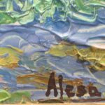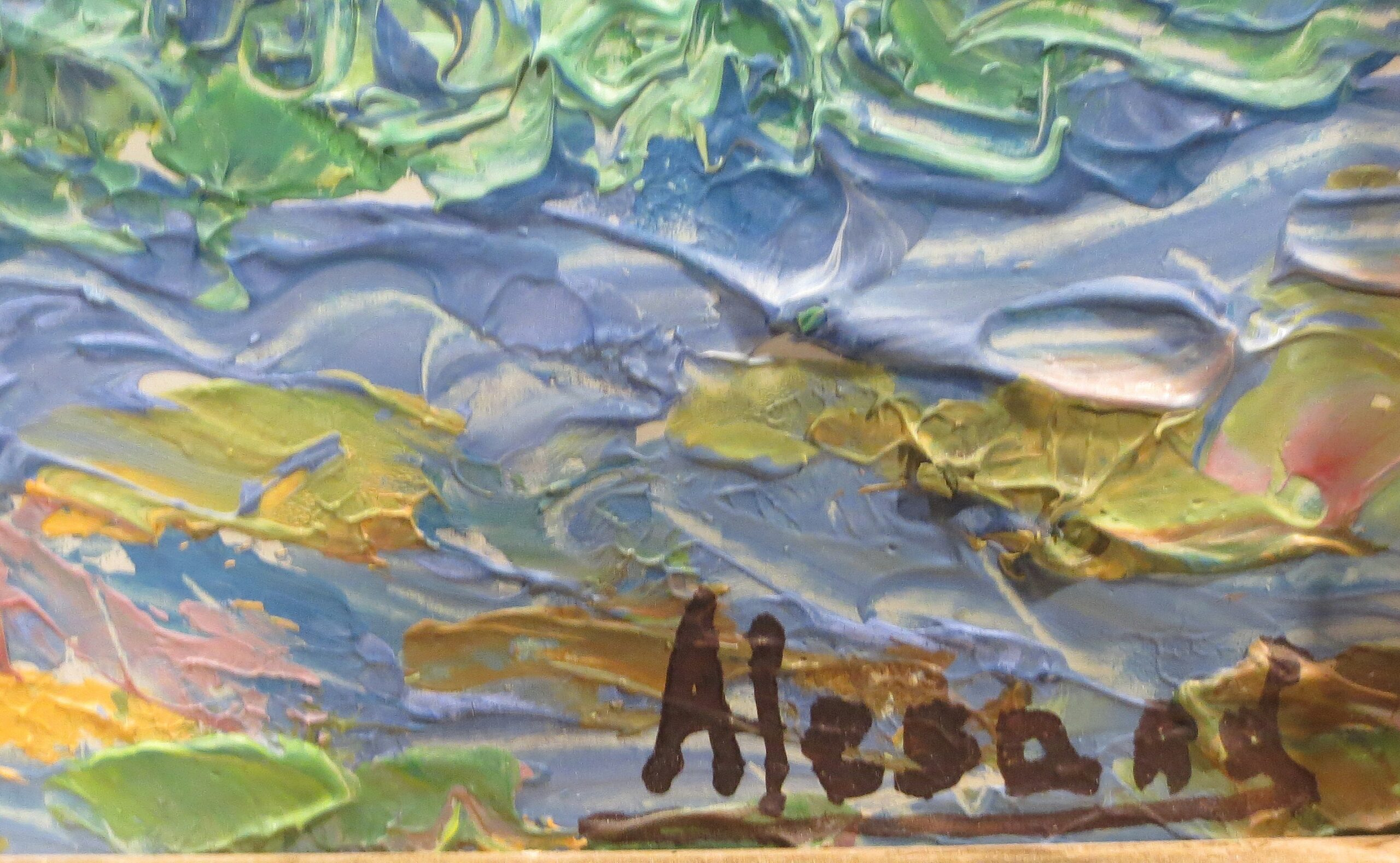 Óleo sobre tabla, con técnica mixta de pincel y paleta firmado por el pintor guiado por las técnicas de Vincent Van Gogh; del siglo XX.