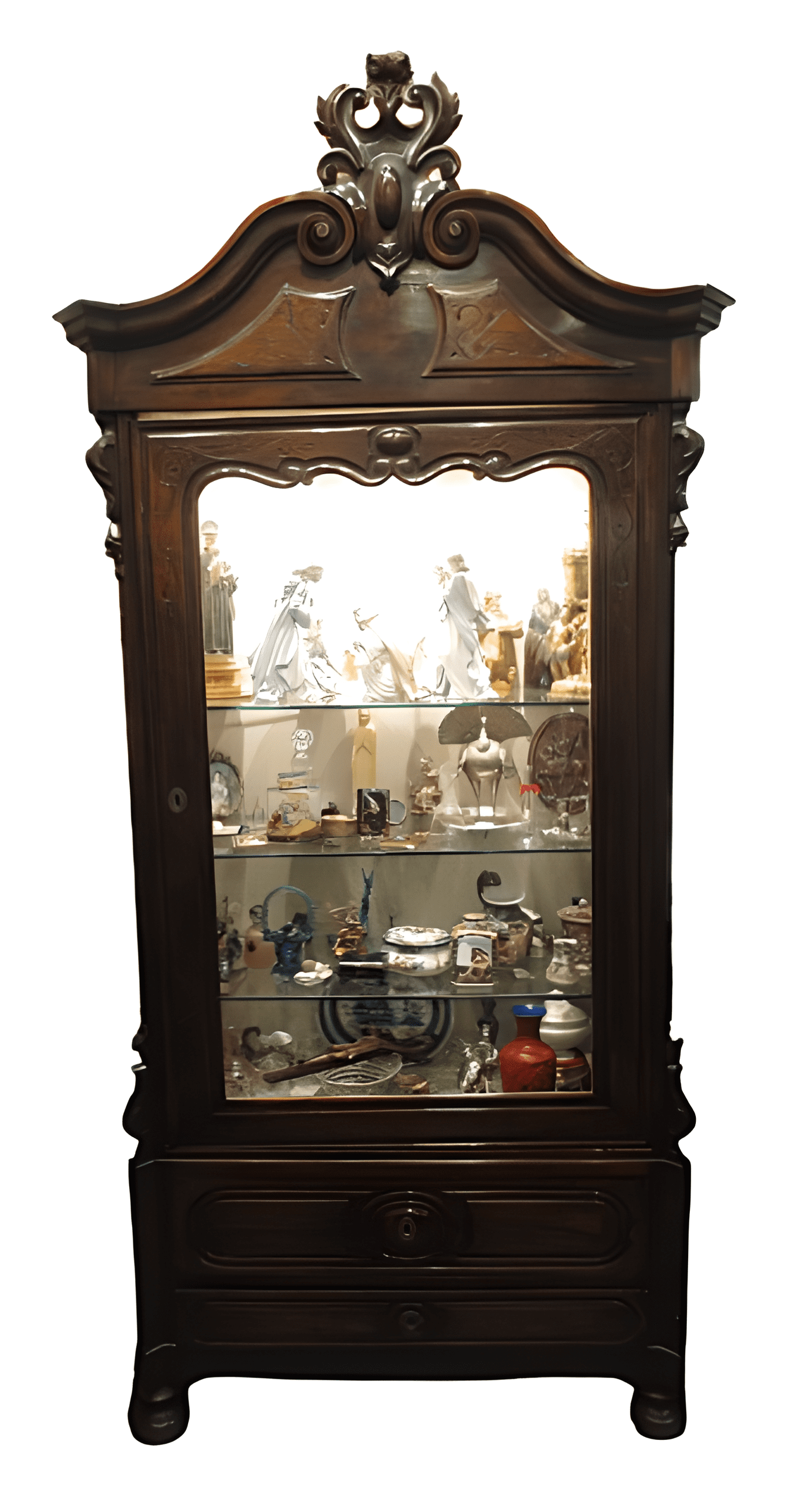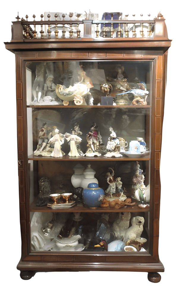 Vitrina de palo-santo, del siglo XIX, Isabelina, que antiguamente fue un armario y ahora se ha convertido en una vitrina con interiores entelados y electrificados.